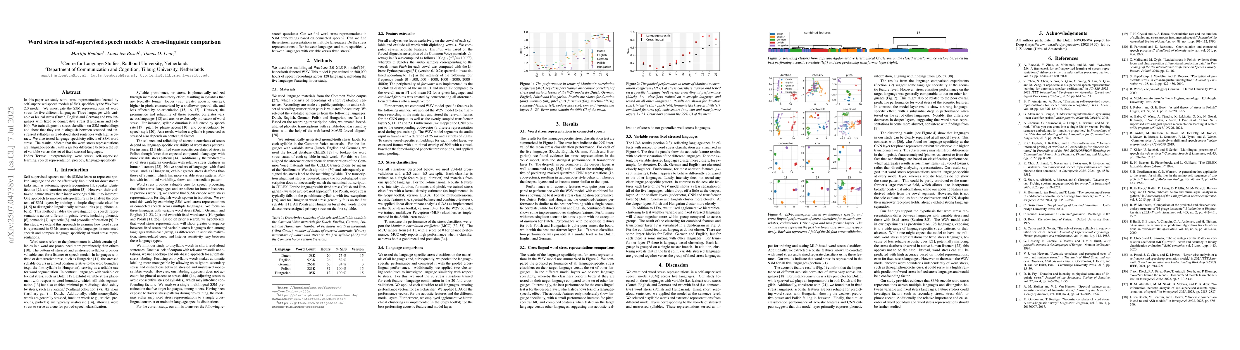 This research investigates word stress representations in self-supervised speech models, specifically Wav2vec 2.0, across five languages. The study trains diagnostic stress classifiers on these embeddings, demonstrating high accuracy in distinguishing stressed and unstressed syllables in read-aloud sentences. Results indicate language-specific word stress representations, with greater differentiation between variable stress languages (Dutch, English, German) and fixed stress languages (Hungarian, Polish).