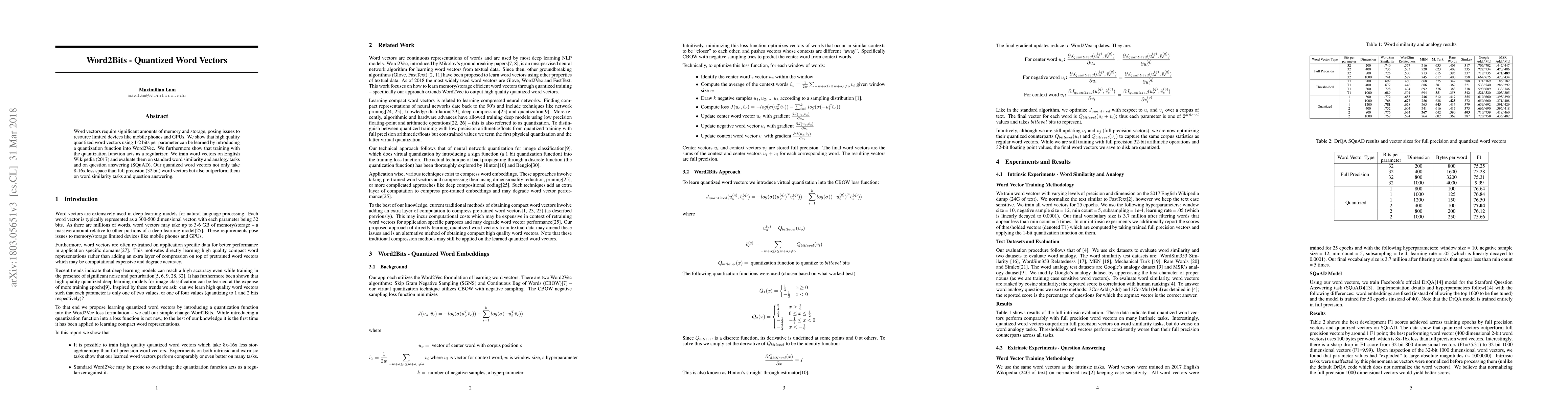 Word vectors require significant amounts of memory and storage, posing issues to resource limited devices like mobile phones and GPUs. We show that high quality quantized word vectors using 1-2 bits per parameter can be learned by introducing a quantization function into Word2Vec. We furthermore show that training with the quantization function acts as a regularizer. We train word vectors on English Wikipedia (2017) and evaluate them on standard word similarity and analogy tasks and on question answering (SQuAD). Our quantized word vectors not only take 8-16x less space than full precision (32 bit) word vectors but also outperform them on word similarity tasks and question answering.