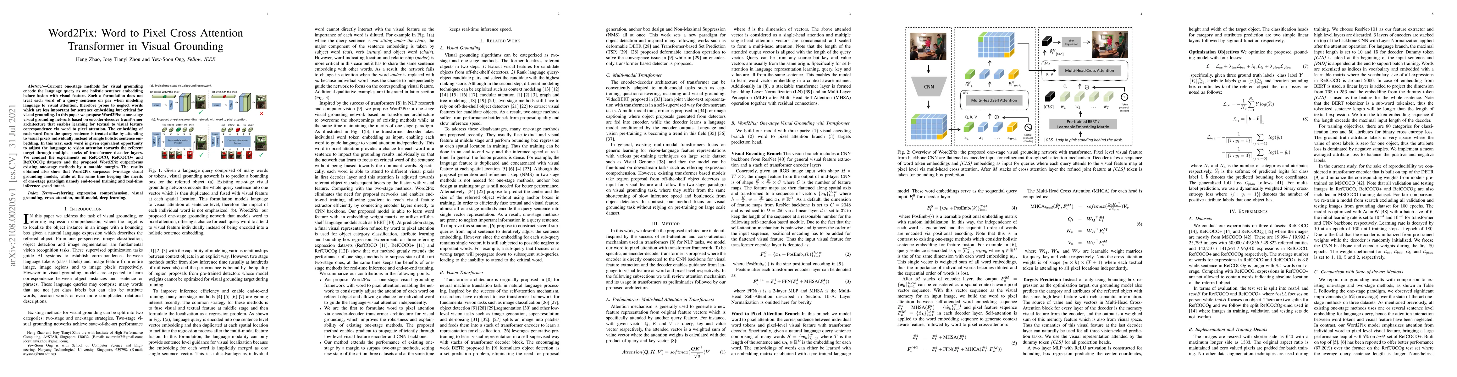 Word2Pix proposes a transformer-based visual grounding network that treats each word in a query sentence equally through word-to-pixel attention, outperforming existing one-stage and two-stage methods on datasets like RefCOCO while maintaining the benefits of one-stage models.