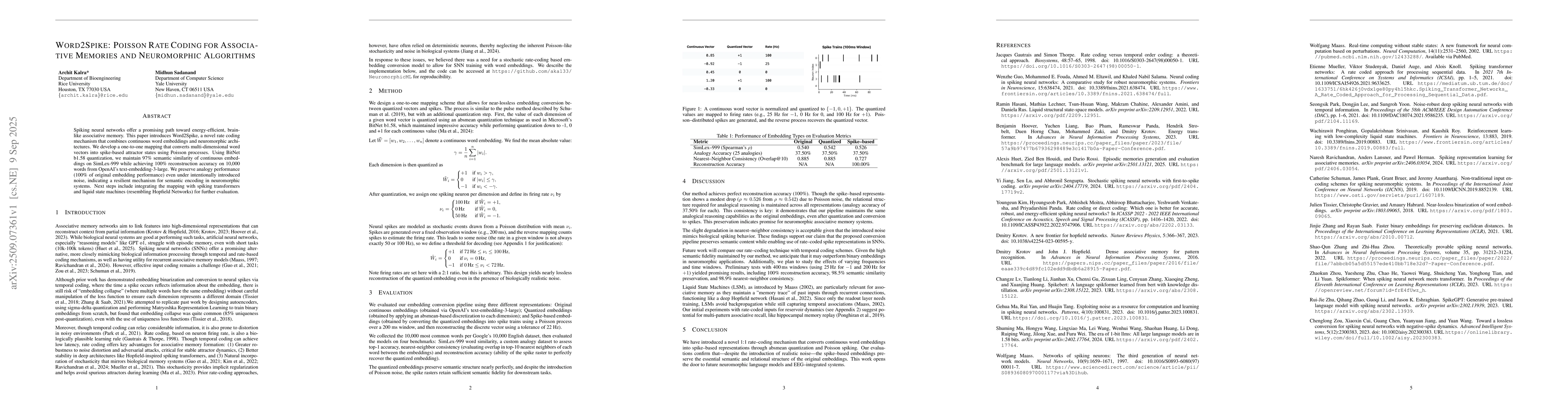 Spiking neural networks offer a promising path toward energy-efficient, brain-like associative memory. This paper introduces Word2Spike, a novel rate coding mechanism that combines continuous word embeddings and neuromorphic architectures. We develop a one-to-one mapping that converts multi-dimensional word vectors into spike-based attractor states using Poisson processes. Using BitNet b1.58 quantization, we maintain 97% semantic similarity of continuous embeddings on SimLex-999 while achieving 100% reconstruction accuracy on 10,000 words from OpenAI's text-embedding-3-large. We preserve analogy performance (100% of original embedding performance) even under intentionally introduced noise, indicating a resilient mechanism for semantic encoding in neuromorphic systems. Next steps include integrating the mapping with spiking transformers and liquid state machines (resembling Hopfield Networks) for further evaluation.