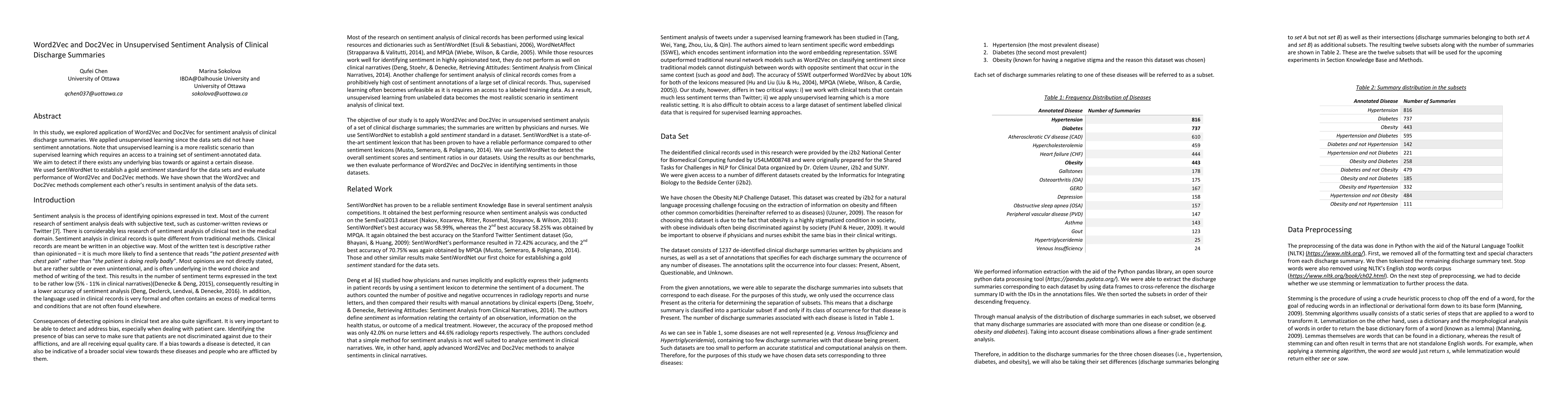 In this study, we explored application of Word2Vec and Doc2Vec for sentiment analysis of clinical discharge summaries. We applied unsupervised learning since the data sets did not have sentiment annotations. Note that unsupervised learning is a more realistic scenario than supervised learning which requires an access to a training set of sentiment-annotated data. We aim to detect if there exists any underlying bias towards or against a certain disease. We used SentiWordNet to establish a gold sentiment standard for the data sets and evaluate performance of Word2Vec and Doc2Vec methods. We have shown that the Word2vec and Doc2Vec methods complement each other results in sentiment analysis of the data sets.