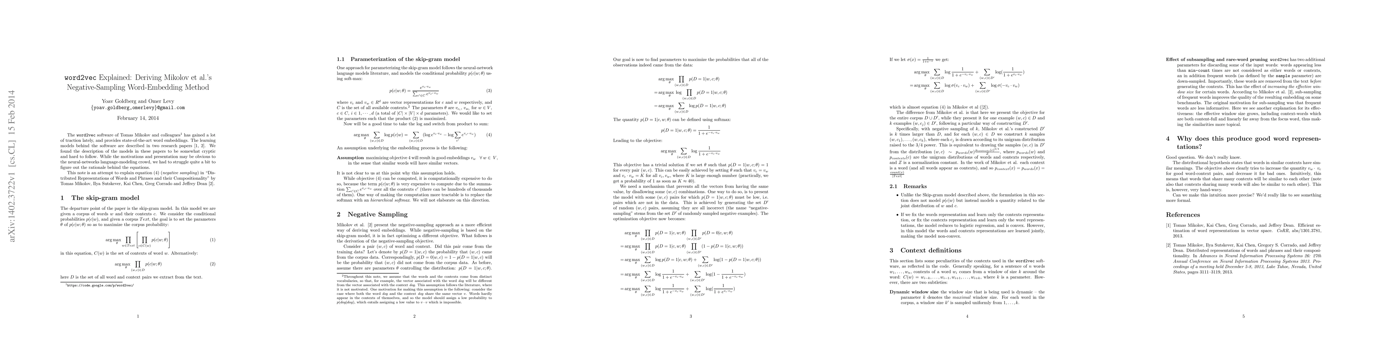 This paper clarifies the negative-sampling method used in word2vec to derive efficient word embeddings by explaining equation (4) from Mikolov et al.'s paper, aiming to make the complex neural-networks modeling more accessible to a broader audience.