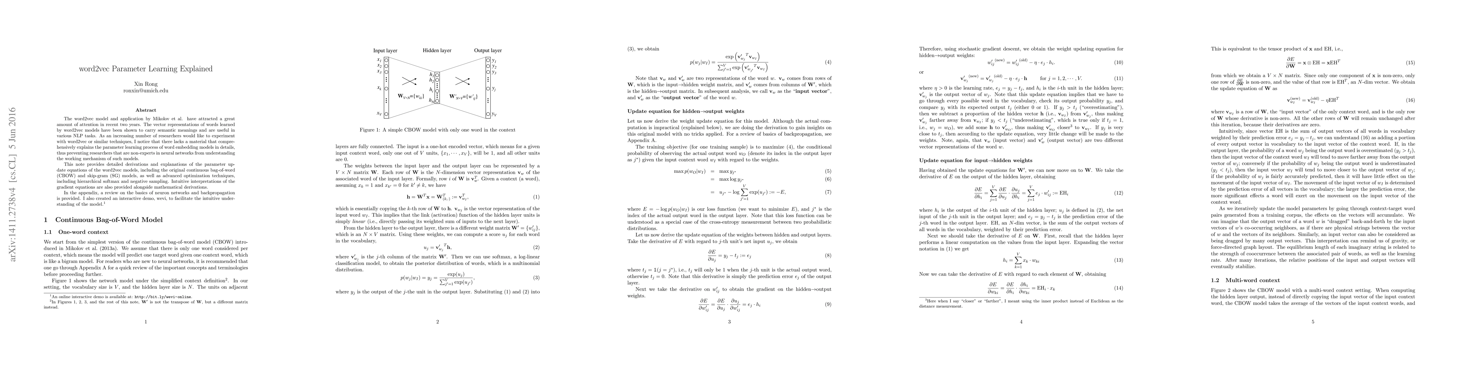 This paper offers a comprehensive explanation of the parameter learning process in word2vec models, detailing the derivations and interpretations of the CBOW and skip-gram algorithms, along with advanced optimization techniques like hierarchical softmax and negative sampling. An interactive demo is also provided to enhance understanding.
