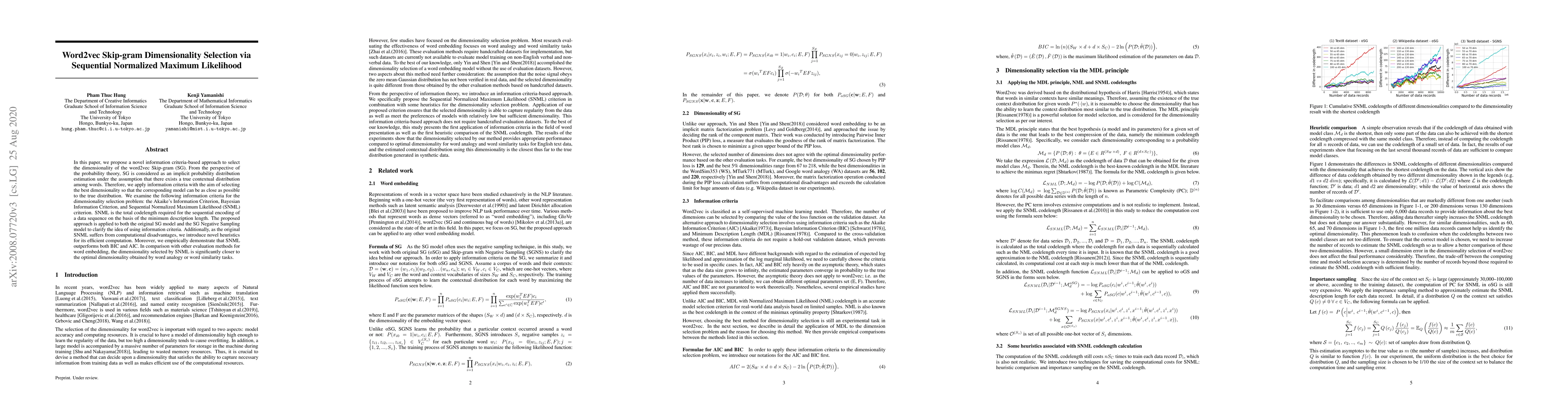 In this paper, we propose a novel information criteria-based approach to select the dimensionality of the word2vec Skip-gram (SG). From the perspective of the probability theory, SG is considered as an implicit probability distribution estimation under the assumption that there exists a true contextual distribution among words. Therefore, we apply information criteria with the aim of selecting the best dimensionality so that the corresponding model can be as close as possible to the true distribution. We examine the following information criteria for the dimensionality selection problem: the Akaike Information Criterion, Bayesian Information Criterion, and Sequential Normalized Maximum Likelihood (SNML) criterion. SNML is the total codelength required for the sequential encoding of a data sequence on the basis of the minimum description length. The proposed approach is applied to both the original SG model and the SG Negative Sampling model to clarify the idea of using information criteria. Additionally, as the original SNML suffers from computational disadvantages, we introduce novel heuristics for its efficient computation. Moreover, we empirically demonstrate that SNML outperforms both BIC and AIC. In comparison with other evaluation methods for word embedding, the dimensionality selected by SNML is significantly closer to the optimal dimensionality obtained by word analogy or word similarity tasks.