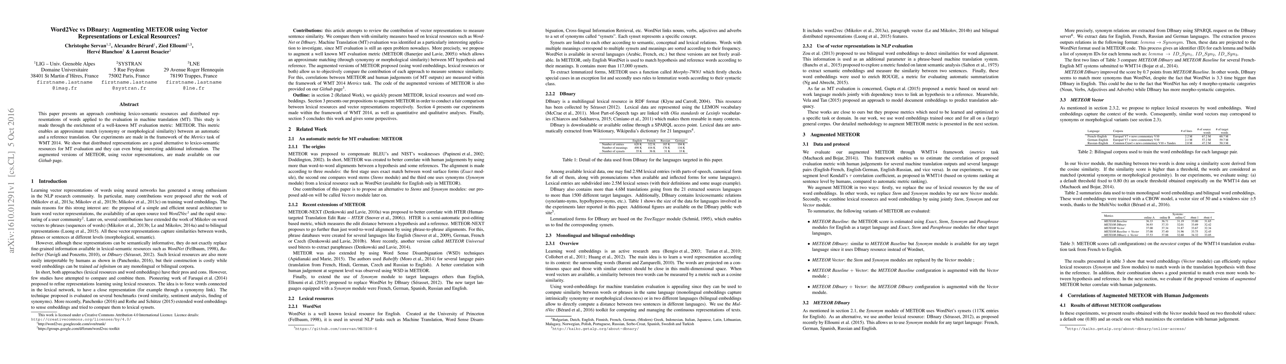 This paper presents an approach combining lexico-semantic resources and distributed representations of words applied to the evaluation in machine translation (MT). This study is made through the enrichment of a well-known MT evaluation metric: METEOR. This metric enables an approximate match (synonymy or morphological similarity) between an automatic and a reference translation. Our experiments are made in the framework of the Metrics task of WMT 2014. We show that distributed representations are a good alternative to lexico-semantic resources for MT evaluation and they can even bring interesting additional information. The augmented versions of METEOR, using vector representations, are made available on our Github page.