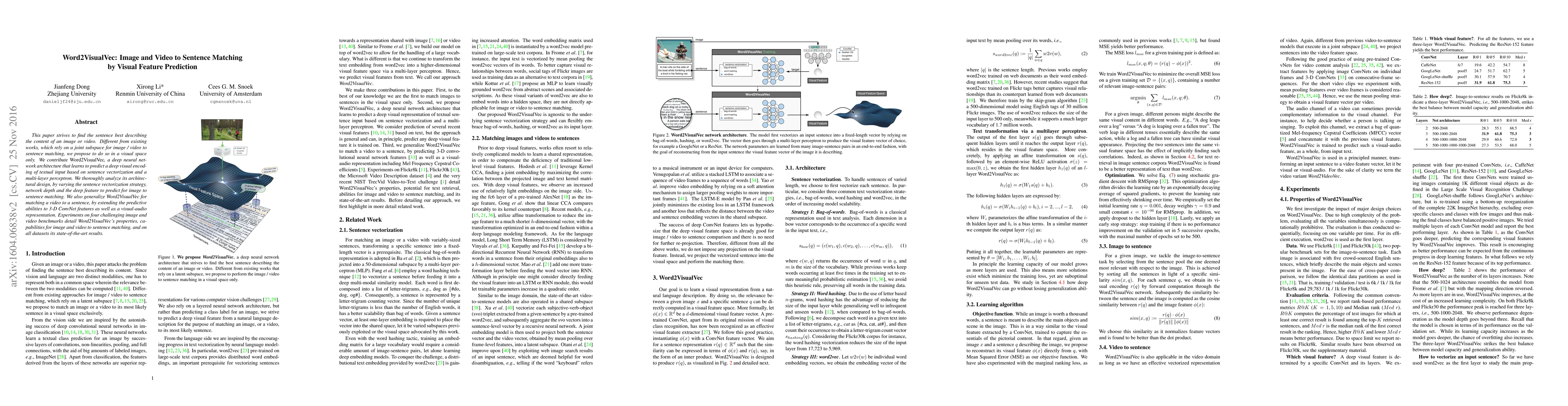 This paper strives to find the sentence best describing the content of an image or video. Different from existing works, which rely on a joint subspace for image / video to sentence matching, we propose to do so in a visual space only. We contribute Word2VisualVec, a deep neural network architecture that learns to predict a deep visual encoding of textual input based on sentence vectorization and a multi-layer perceptron. We thoroughly analyze its architectural design, by varying the sentence vectorization strategy, network depth and the deep feature to predict for image to sentence matching. We also generalize Word2VisualVec for matching a video to a sentence, by extending the predictive abilities to 3-D ConvNet features as well as a visual-audio representation. Experiments on four challenging image and video benchmarks detail Word2VisualVec's properties, capabilities for image and video to sentence matching, and on all datasets its state-of-the-art results.