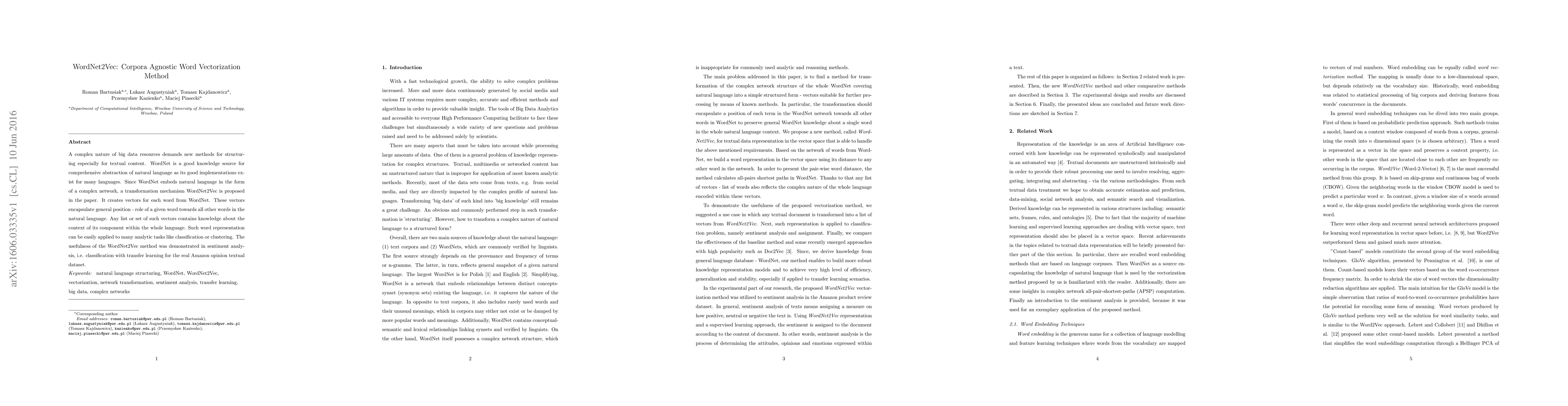 A complex nature of big data resources demands new methods for structuring especially for textual content. WordNet is a good knowledge source for comprehensive abstraction of natural language as its good implementations exist for many languages. Since WordNet embeds natural language in the form of a complex network, a transformation mechanism WordNet2Vec is proposed in the paper. It creates vectors for each word from WordNet. These vectors encapsulate general position - role of a given word towards all other words in the natural language. Any list or set of such vectors contains knowledge about the context of its component within the whole language. Such word representation can be easily applied to many analytic tasks like classification or clustering. The usefulness of the WordNet2Vec method was demonstrated in sentiment analysis, i.e. classification with transfer learning for the real Amazon opinion textual dataset.
