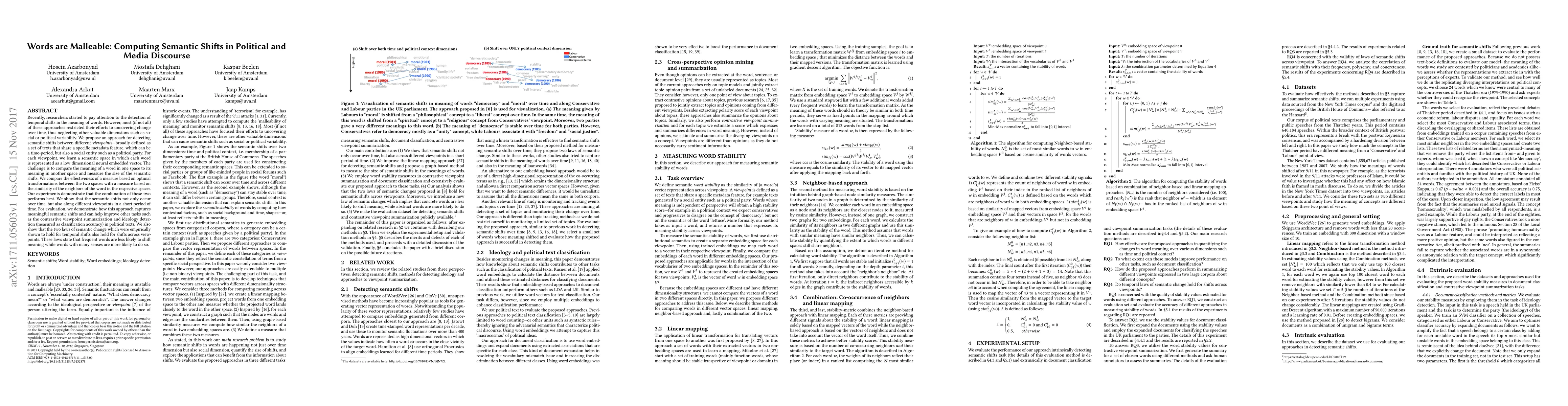 Researchers developed a method to detect semantic shifts in words across different viewpoints, showing that meaning changes can occur both over time and along various social or political perspectives, with frequent words less likely to shift and words with multiple senses more likely to do so.