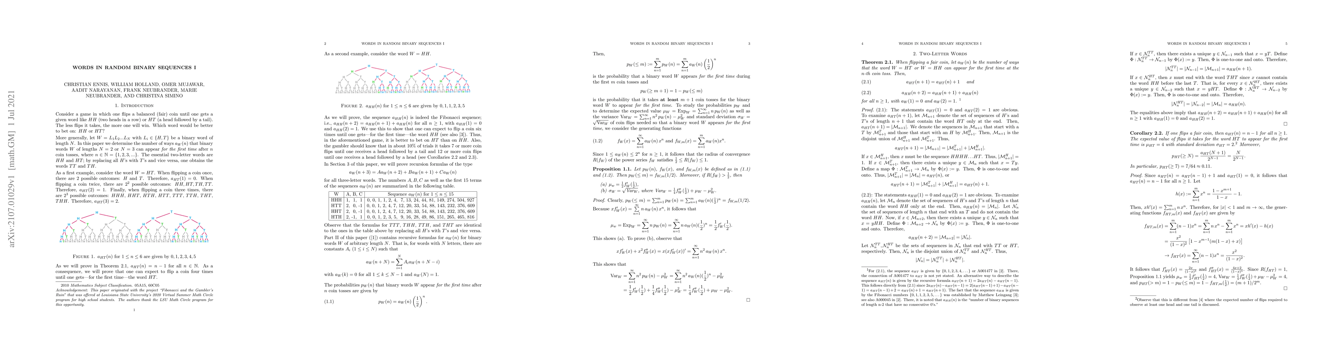 When flipping a fair coin, let $W = L_1L_2...L_N$ with $L_i\in\{H,T\}$ be a binary word of length $N=2$ or $N=3$. In this paper, we establish second- and third-order linear recurrence relations and their generating functions to discuss the probabilities $p_{W}(n)$ that binary words $W$ appear for the first time after $n$ coin tosses.