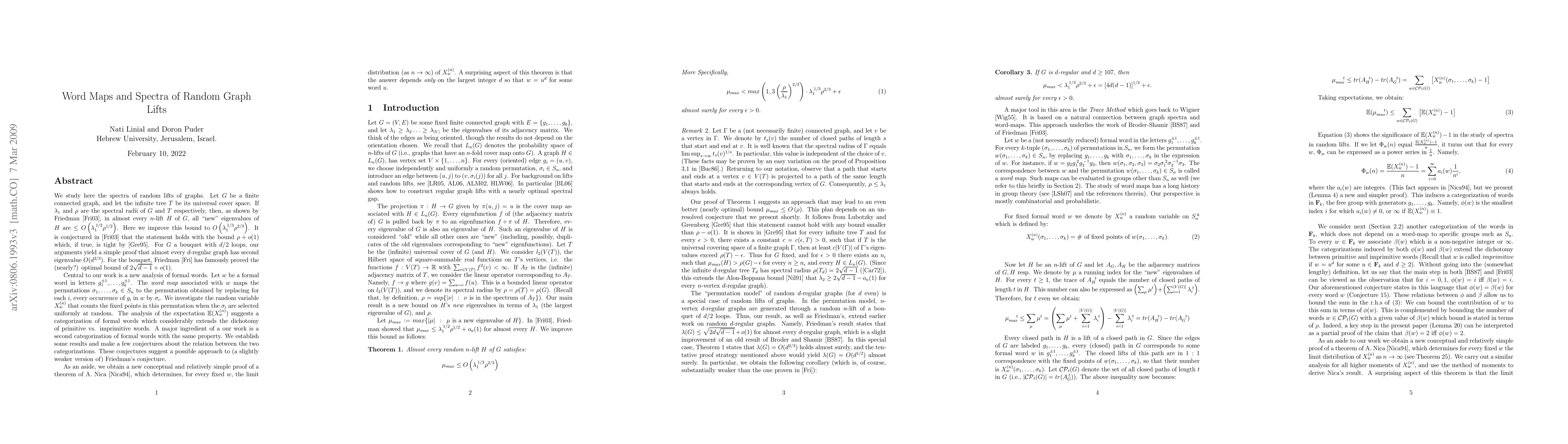 We begin with a new analysis of formal words. Let w be a formal word in letters g_1,...,g_k. The word map associated with w maps the permutations s_1,...,s_k in S_n to the permutation obtained by replacing for each i, every occurrence of g_i in w by s_i. We investigate the random variable X_w^n that counts the fixed points in this permutation when the s_i are selected uniformly at random. A major ingredient of our work is a new categorization of words which considerably extends the dichotomy of primitive vs. imprimitive words. We establish some results and make a few conjectures about the relation between the expectation E(X_w^n) and this new categorization. This analysis contributes deeply to our study of the spectra of random lifts of graphs. Let G be a connected graph, and let the infinite tree T be its universal cover space. If L and R are the spectral radii of G and T respectively, then, as shown by J. Friedman, for almost every n-lift H of G, all "new" eigenvalues of H are < O(L^(1/2)R^(1/2)). We improve this upper bound to O(L^(1/3)R^(2/3)), and our aforementioned conjectures suggest a possible approach to proving an upper bound of O(R). This is a generalization of the problem of bounding the second eigenvalue in a random 2d-regular graph. As an aside, we obtain a new conceptual and relatively simple proof of a theorem of A. Nica, which determines, for every fixed w, the limit distribution (as n \to \infty) of X_w^n. A surprising aspect of this theorem is that the answer depends only on the largest integer d so that w=u^d for some word u.