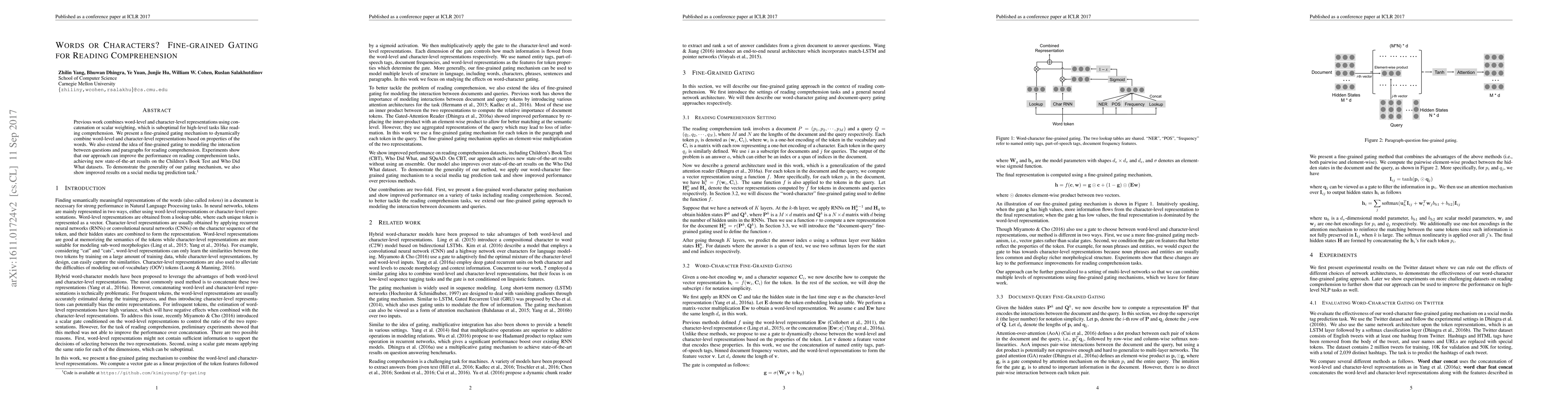 This paper introduces a fine-grained gating mechanism to dynamically blend word-level and character-level representations for enhanced reading comprehension, achieving state-of-the-art results on the Children's Book Test dataset and improved performance on social media tag prediction.