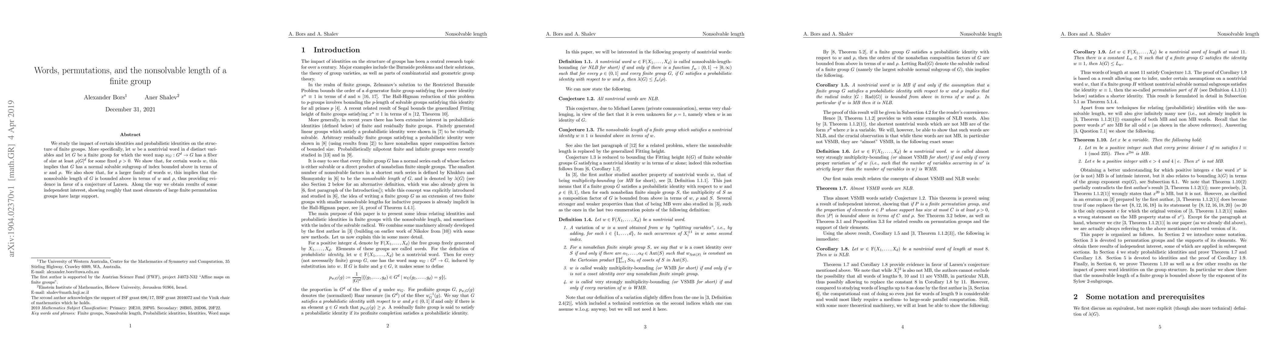 This paper investigates how specific group identities and probabilistic identities affect the structure of finite groups, proving that under certain conditions, the group must contain a normal solvable subgroup or have a bounded nonsolvable length, supporting a conjecture by Larsen. Additionally, it finds that most elements in large permutation groups tend to have large support.