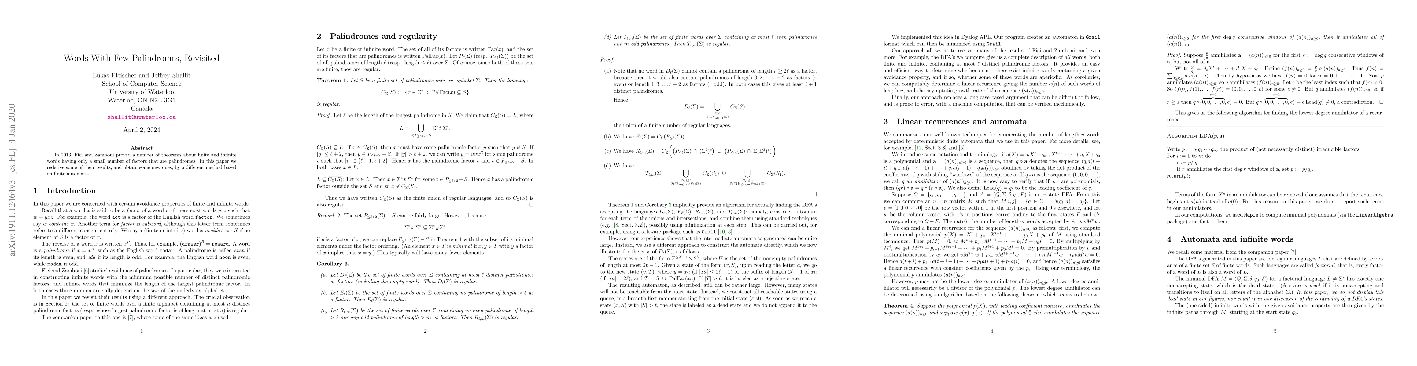This paper revisits theorems from 2013 regarding words with limited palindromic factors, rederivations using finite automata, and introduces new findings through a different methodological approach.