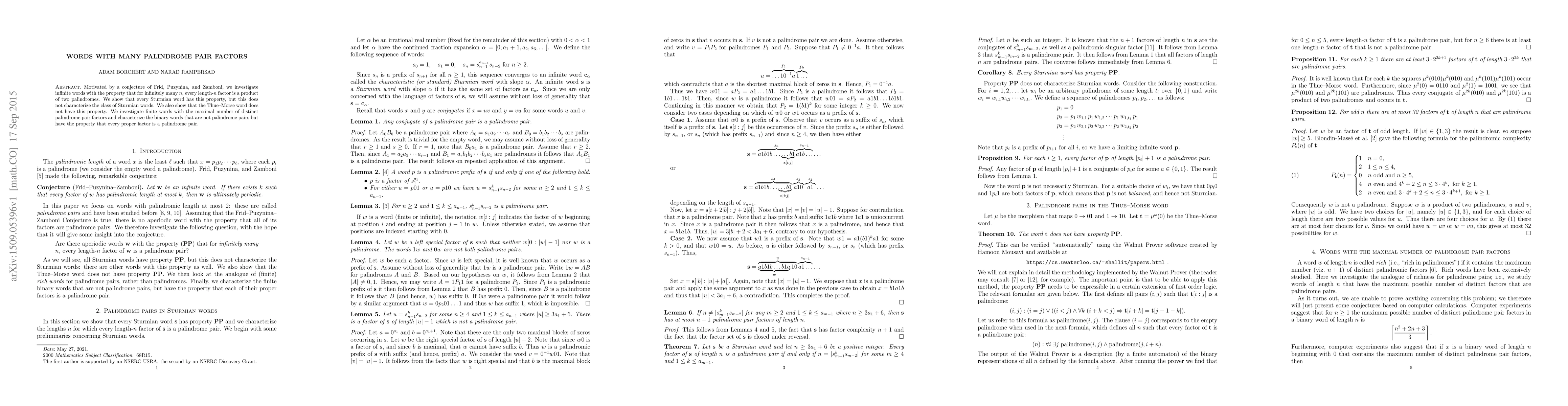 This paper explores infinite words where every length-n factor can be expressed as a product of two palindromes for infinitely many n. It confirms that Sturmian words possess this property but does not define them exclusively. Conversely, the Thue-Morse word lacks this characteristic, and it also examines finite words with the highest number of distinct palindrome pair factors.