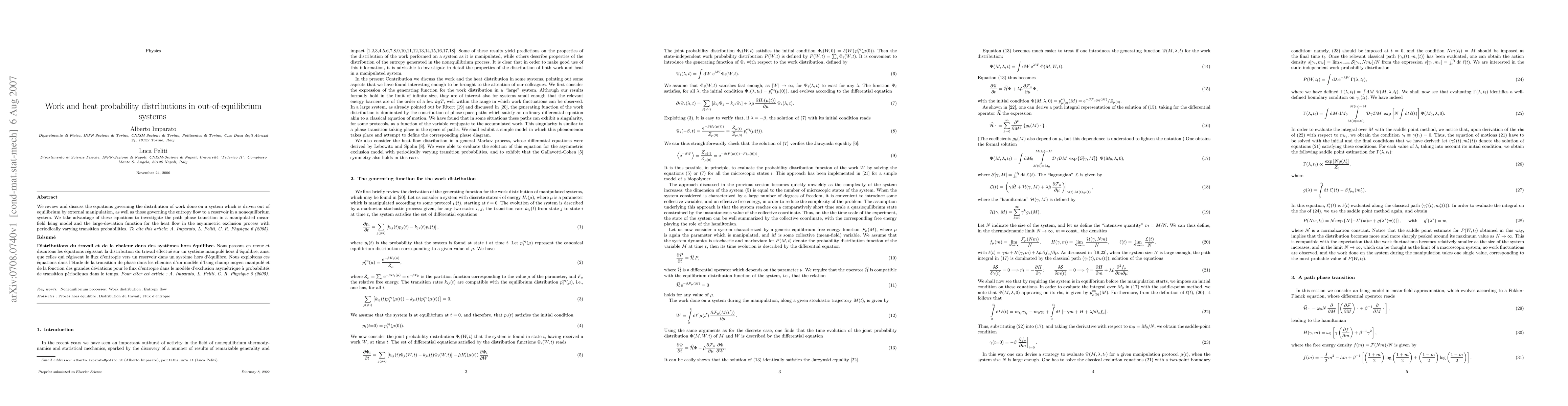 This paper reviews the equations governing work and heat distributions in out-of-equilibrium systems, applying these to investigate phase transitions in a mean-field Ising model and the large-deviation function for heat flow in an asymmetric exclusion process.