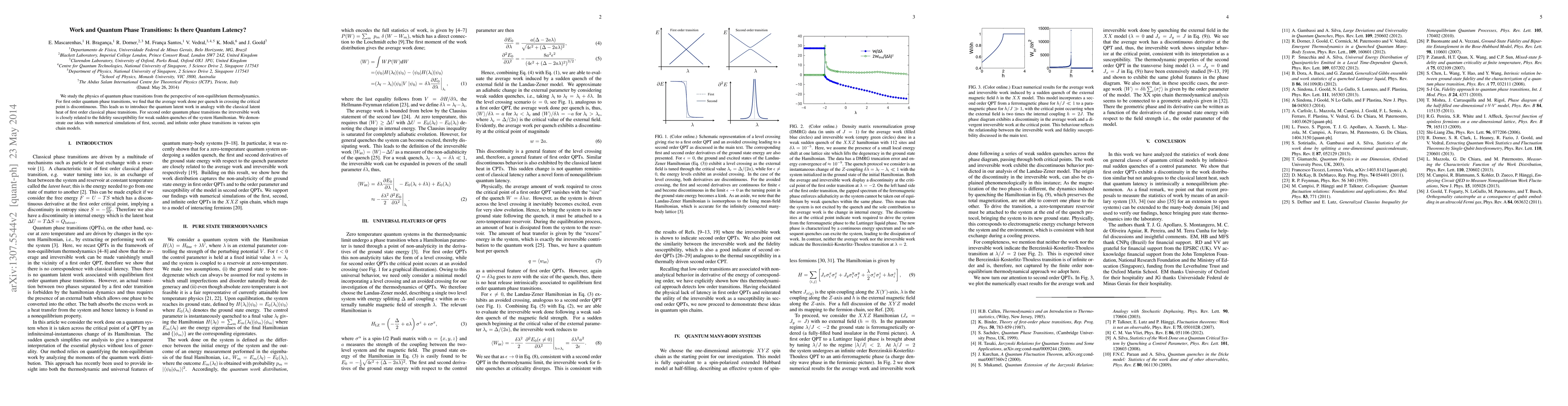 Researchers investigated quantum phase transitions, finding that first-order transitions have discontinuous work done per quench, introducing the concept of quantum latent work. For second-order transitions, irreversible work is linked to the system's fidelity susceptibility.
