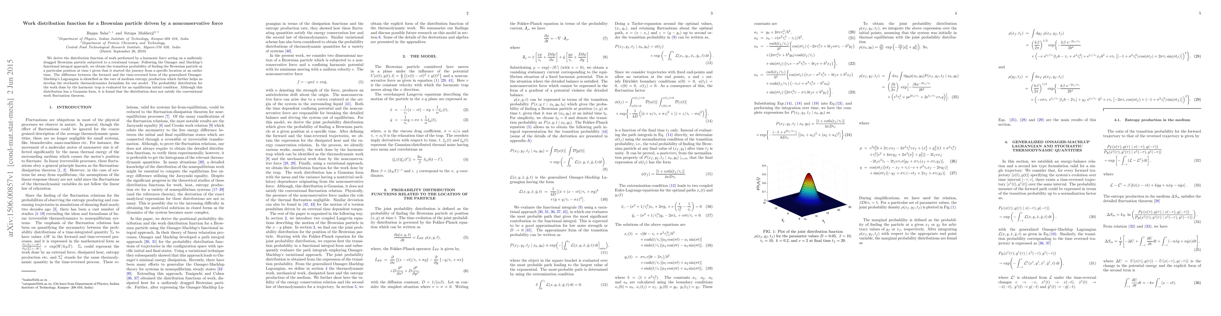 This paper derives the work distribution function for a Brownian particle under a nonconservative force, using Onsager and Machlup's functional integral approach. It finds that while the work distribution is Gaussian, it does not conform to the conventional work fluctuation theorem.