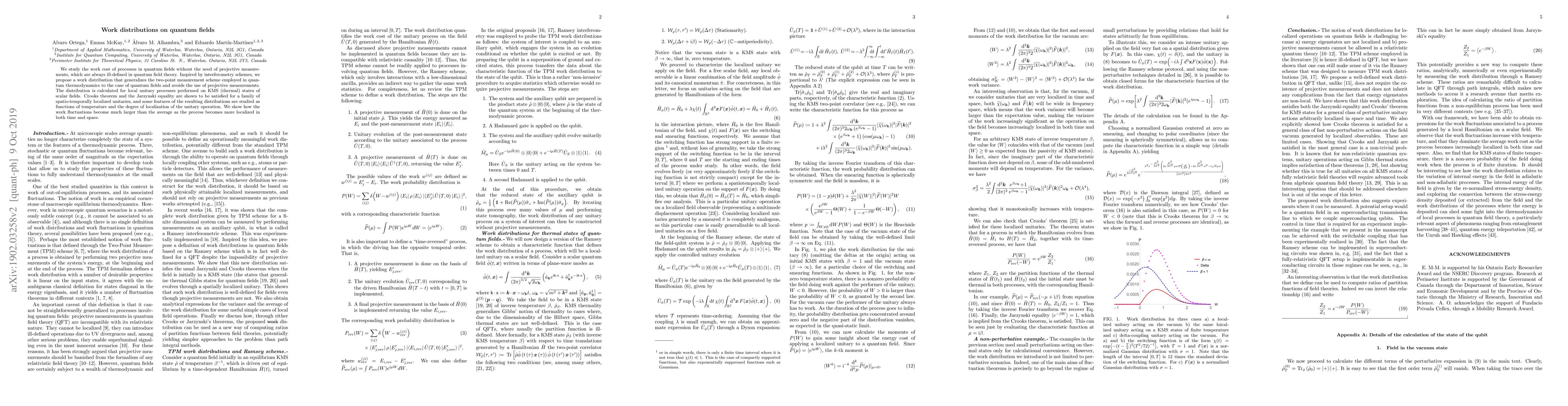 We study the work cost of processes in quantum fields without the need of projective measurements, which are always ill defined in quantum field theory. Inspired by interferometry schemes, we propose a work distribution that generalizes the two-point measurement scheme employed in quantum thermodynamics to the case of quantum fields and avoids the use of projective measurements. The distribution is calculated for local unitary processes performed on Kubo-Martin-Schwinger (thermal) states of scalar fields. Crooks theorem and the Jarzynski equality are shown to be satisfied for a family of spatio-temporally localized unitaries, and some features of the resulting distributions are studied as functions of temperature and the degree of localization of the unitary operation. We show how the work fluctuations become much larger than the average as the process becomes more localized in both time and space.