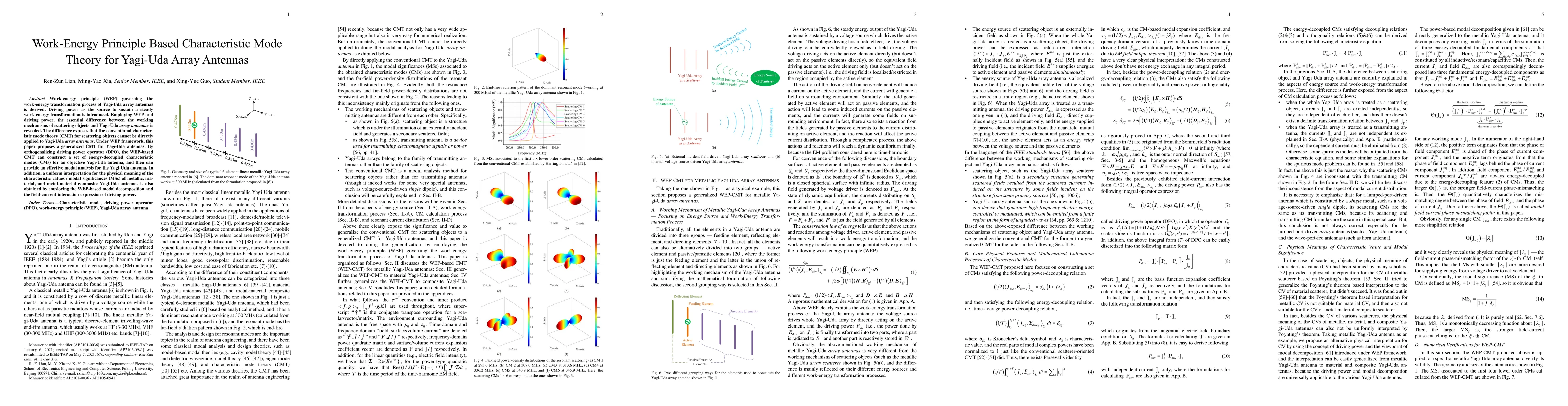This paper derives a work-energy principle (WEP) for the Yagi-Uda array antenna, proposing a generalized characteristic mode theory (CMT) that accounts for driving power. The WEP-based CMT provides energy-decoupled modes for effective analysis and a uniform interpretation of modal significances for different Yagi-Uda antenna types.