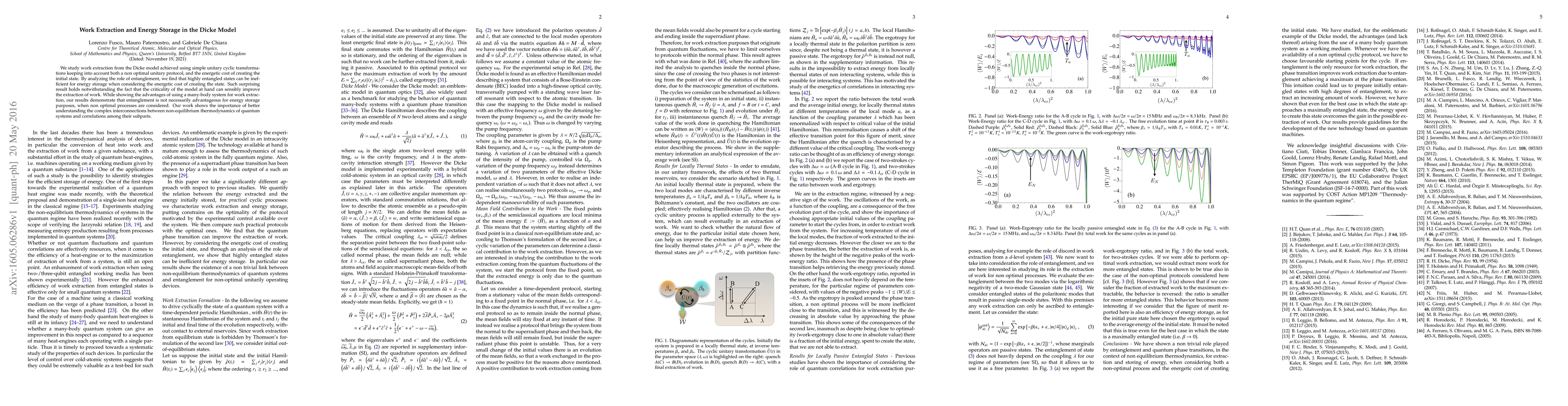 This paper investigates work extraction in the Dicke model using unitary cyclic transformations, revealing that highly entangled states may be inefficient for energy storage due to the energetic cost of their creation. The study highlights the nuanced relationship between entanglement, energy storage, and non-equilibrium thermodynamics in quantum systems.