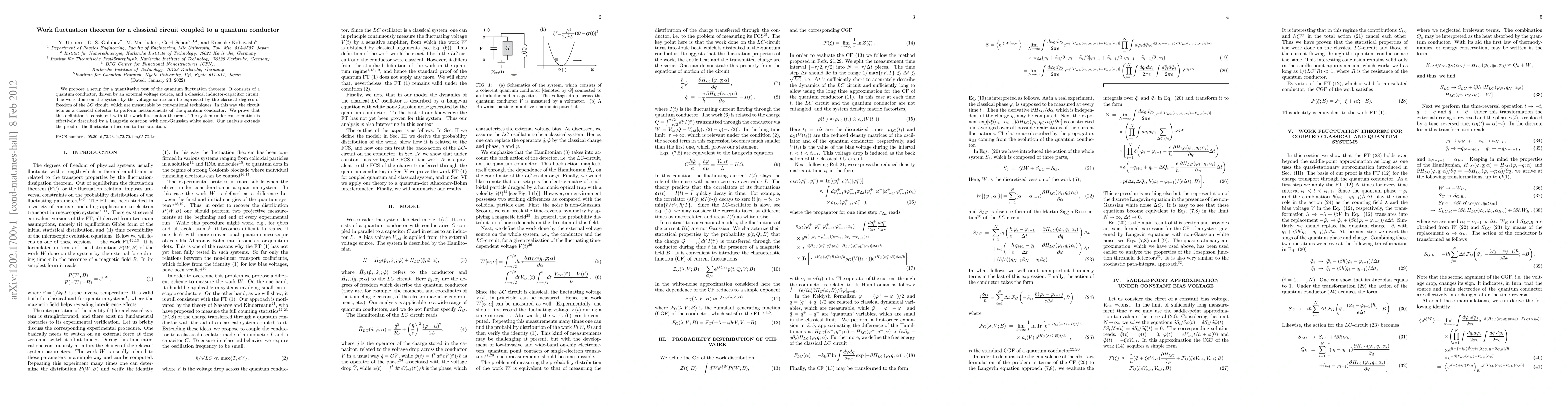 This paper proposes a classical LC circuit coupled to a quantum conductor to test the quantum fluctuation theorem, demonstrating that the classical circuit can measure the quantum system's work. The authors prove consistency with the work fluctuation theorem using a Langevin equation with non-Gaussian noise.