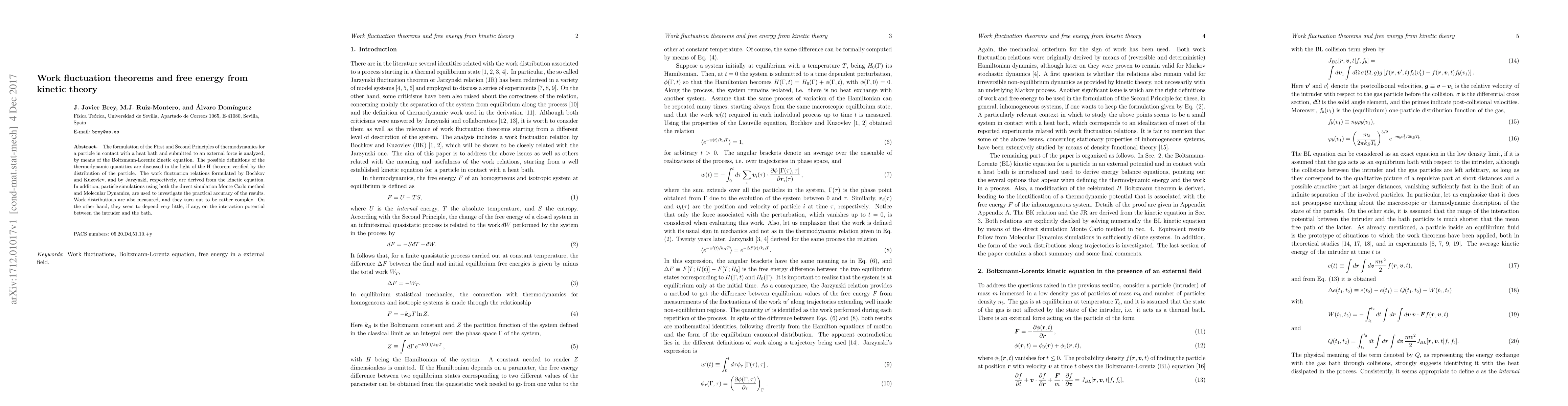 The formulation of the First and Second Principles of thermodynamics for a particle in contact with a heat bath and submitted to an external force is analyzed, by means of the Boltzmann-Lorentz kinetic equation. The possible definitions of the thermodynamic quantities are discussed in the light of the H theorem verified by the distribution of the particle. The work fluctuation relations formulated by Bochkov and Kuzovlev, and by Jarzynski, respectively, are derived from the kinetic equation. In addition, particle simulations using both the direct simulation Monte Carlo method and Molecular Dynamics, are used to investigate the practical accuracy of the results. Work distributions are also measured, and they turn out to be rather complex. On the other hand, they seem to depend very little, if any, on the interaction potential between the intruder and the bath.