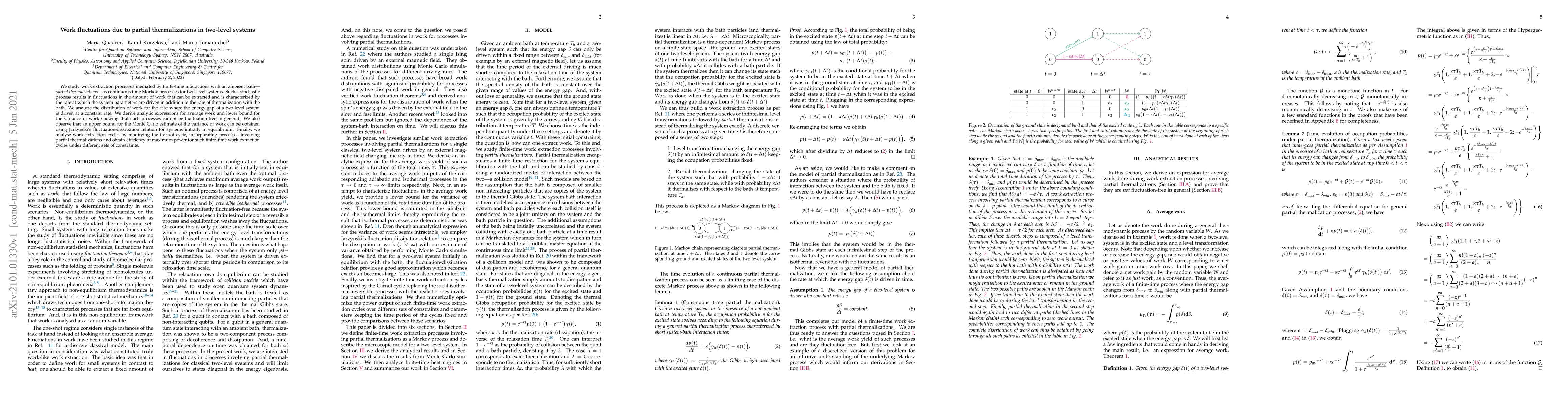 This paper investigates work extraction in two-level systems through partial thermalizations, revealing fluctuations in extractable work due to finite-time interactions with a thermal bath. It derives expressions for average work and variance, demonstrating that such processes are inherently fluctuation-prone and utilizes Jarzynski's relation to establish an upper bound for variance estimation.