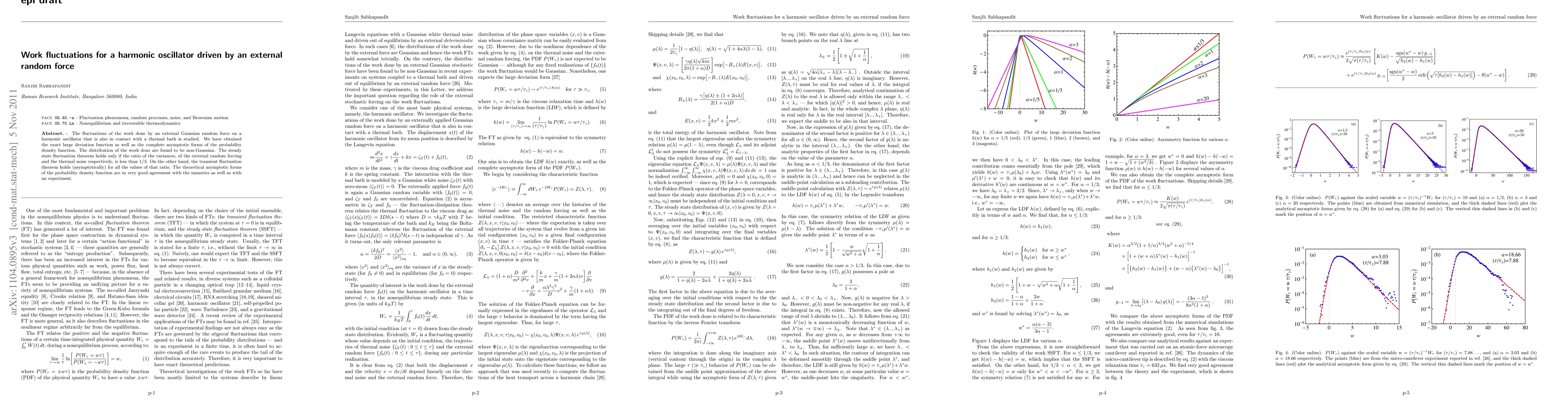 This paper investigates the work fluctuations on a harmonic oscillator subjected to an external Gaussian random force and thermal noise, deriving the exact large deviation function and probability density function. The study reveals non-Gaussian work distributions and finds that the steady state fluctuation theorem applies only when the ratio of external force variance to thermal noise variance is less than 1/3, while the transient theorem holds for all ratios.