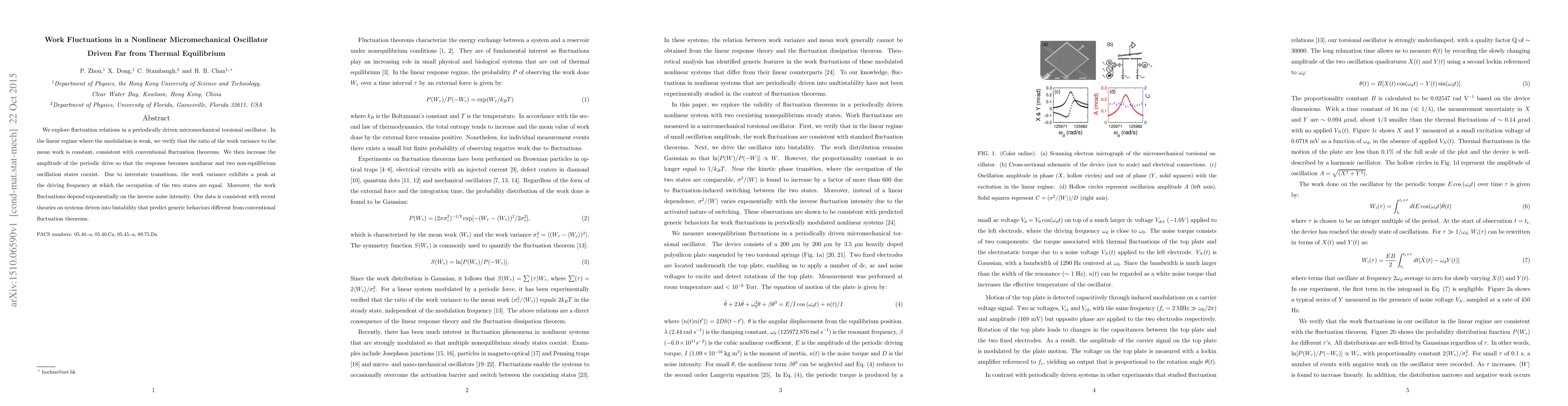 We explore fluctuation relations in a periodically driven micromechanical torsional oscillator. In the linear regime where the modulation is weak, we verify that the ratio of the work variance to the mean work is constant, consistent with conventional fluctuation theorems. We then increase the amplitude of the periodic drive so that the response becomes nonlinear and two nonequilibrium oscillation states coexist. Due to interstate transitions, the work variance exhibits a peak at the driving frequency at which the occupation of the two states is equal. Moreover, the work fluctuations depend exponentially on the inverse noise intensity. Our data are consistent with recent theories on systems driven into bistability that predict generic behaviors different from conventional fluctuation theorems.