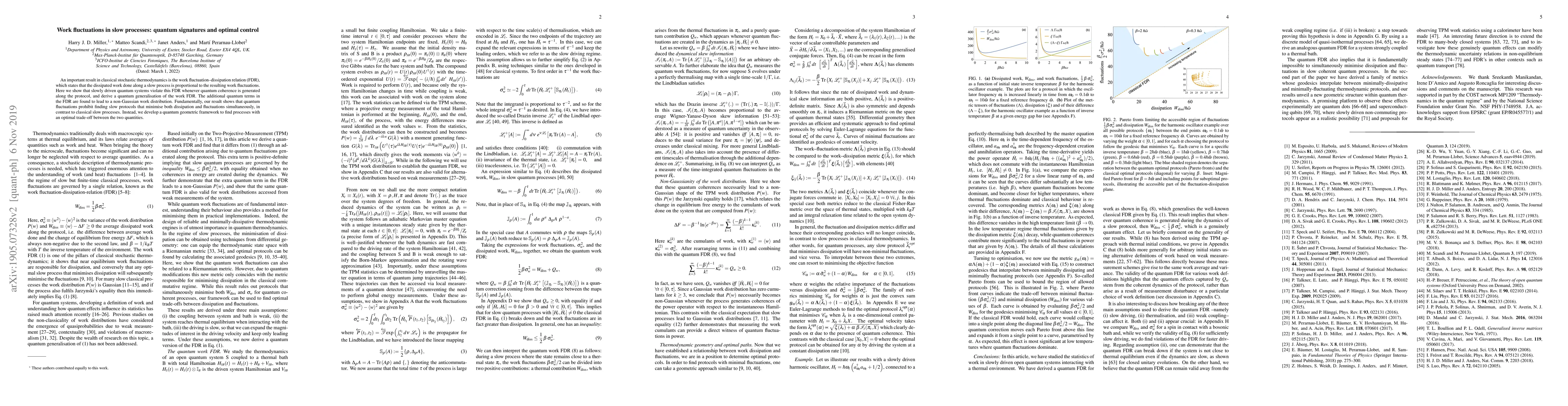 This paper explores the violation of the classical work fluctuation-dissipation relation in quantum systems, revealing that quantum coherence generates non-Gaussian work distributions. It proposes a quantum generalization of the work FDR, demonstrating that quantum fluctuations prevent minimizing both dissipation and fluctuations simultaneously in slow processes.