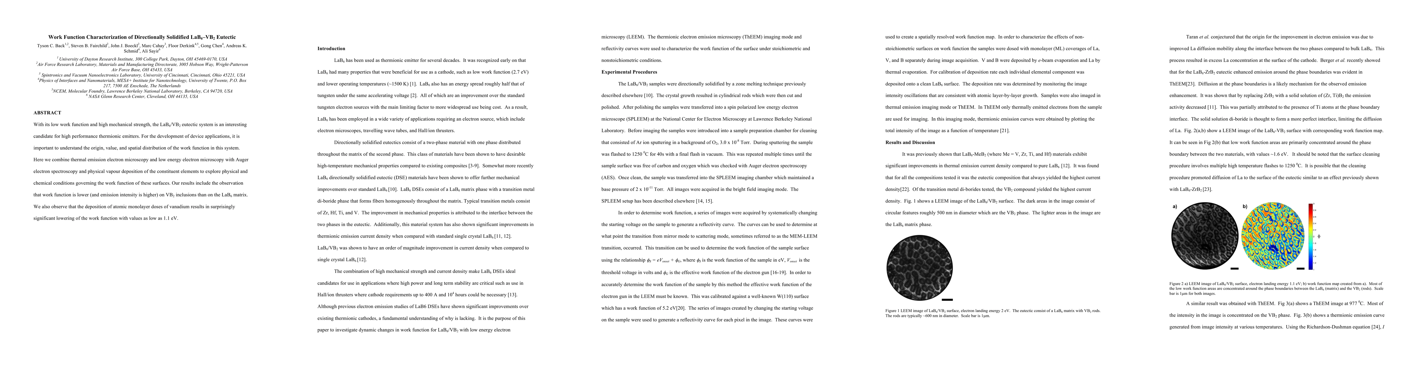 With its low work function and high mechanical strength, the LaB6/VB2 eutectic system is an interesting candidate for high performance thermionic emitters. For the development of device applications, it is important to understand the origin, value, and spatial distribution of the work function in this system. Here we combine thermal emission electron microscopy and low energy electron microscopy with Auger electron spectroscopy and physical vapour deposition of the constituent elements to explore physical and chemical conditions governing the work function of these surfaces. Our results include the observation that work function is lower (and emission intensity is higher) on VB2 inclusions than on the LaB6 matrix. We also observe that the deposition of atomic monolayer doses of vanadium results in surprisingly significant lowering of the work function with values as low as 1.1 eV.
