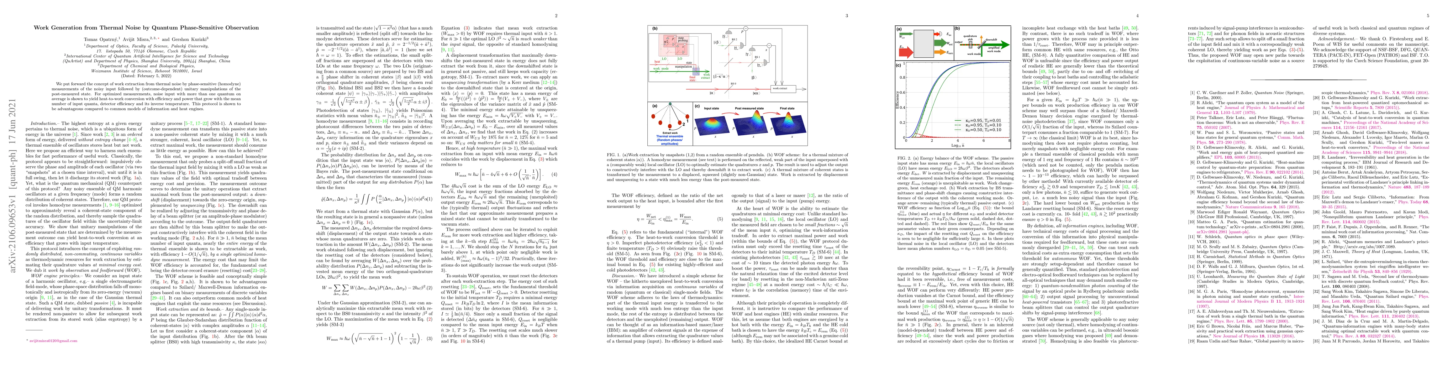 This paper proposes a method for extracting work from thermal noise through phase-sensitive measurements and subsequent unitary manipulations, demonstrating higher efficiency and power growth with input quanta, detector efficiency, and inverse temperature. This approach outperforms traditional information and heat engine models.
