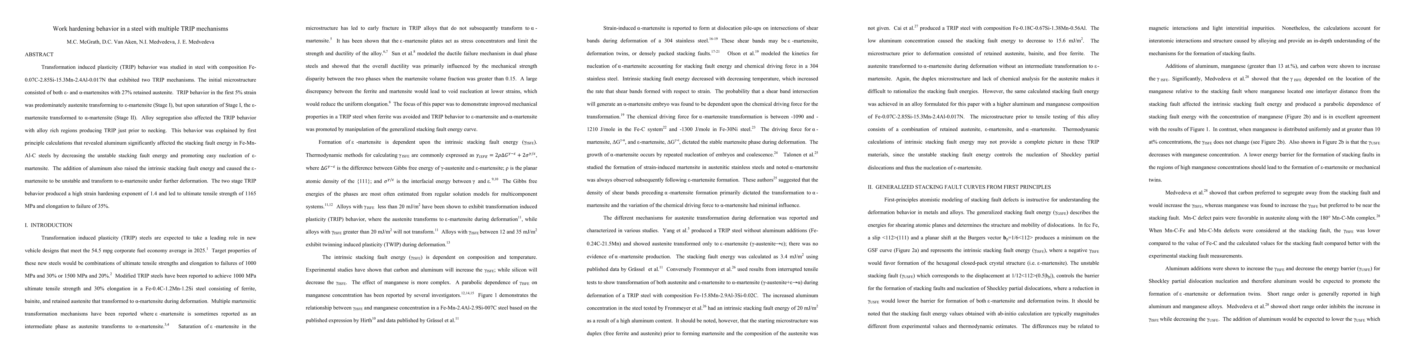 Transformation induced plasticity (TRIP) behavior was studied in steel with composition Fe-0.07C-2.85Si-15.3Mn-2.4Al-0.017N that exhibited two TRIP mechanisms. The initial microstructure consisted of both {\epsilon}- and {\alpha}-martensites with 27% retained austenite. TRIP behavior in the first 5% strain was predominately austenite transforming to {\epsilon}-martensite (Stage I), but upon saturation of Stage I, the {\epsilon}-martensite transformed to {\alpha}-martensite (Stage II). Alloy segregation also affected the TRIP behavior with alloy rich regions producing TRIP just prior to necking. This behavior was explained by first principle calculations that revealed aluminum significantly affected the stacking fault energy in Fe-Mn-Al-C steels by decreasing the unstable stacking fault energy and promoting easy nucleation of {\epsilon}-martensite. The addition of aluminum also raised the intrinsic stacking fault energy and caused the {\epsilon}-martensite to be unstable and transform to {\alpha}-martensite under further deformation. The two stage TRIP behavior produced a high strain hardening exponent of 1.4 and led to ultimate tensile strength of 1165 MPa and elongation to failure of 35%.
