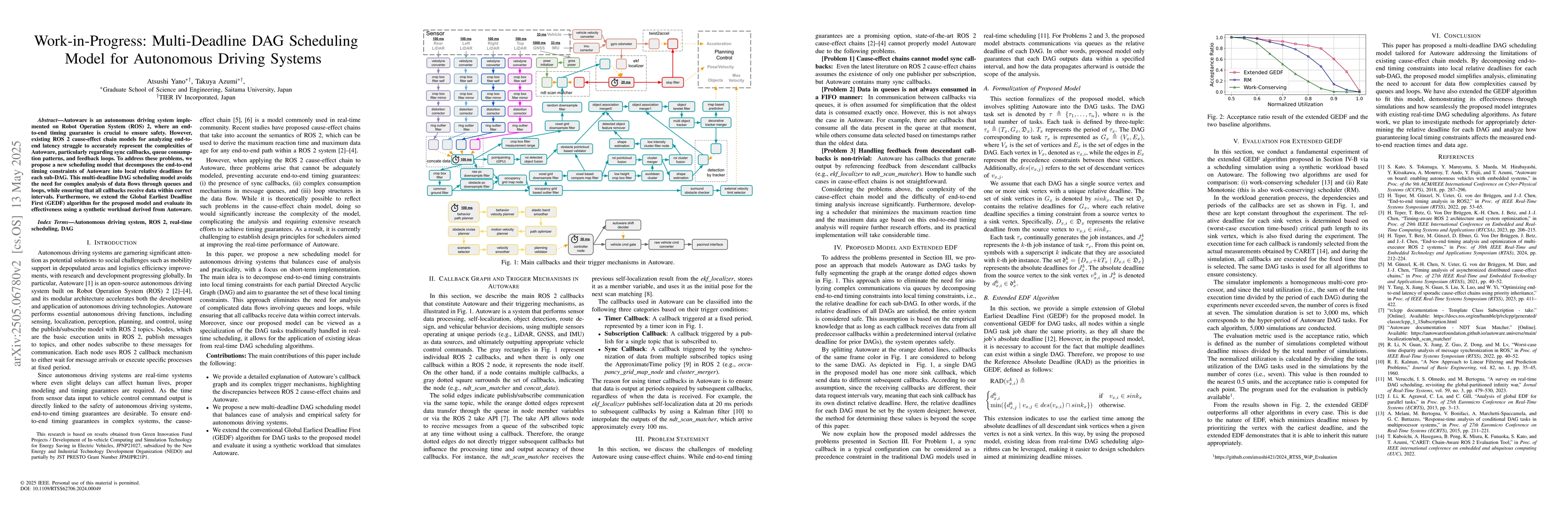 The introduction of a multi-deadline Directed Acyclic Graph (DAG) scheduling model tailored for autonomous driving systems, along with an extension of the GEDF algorithm.