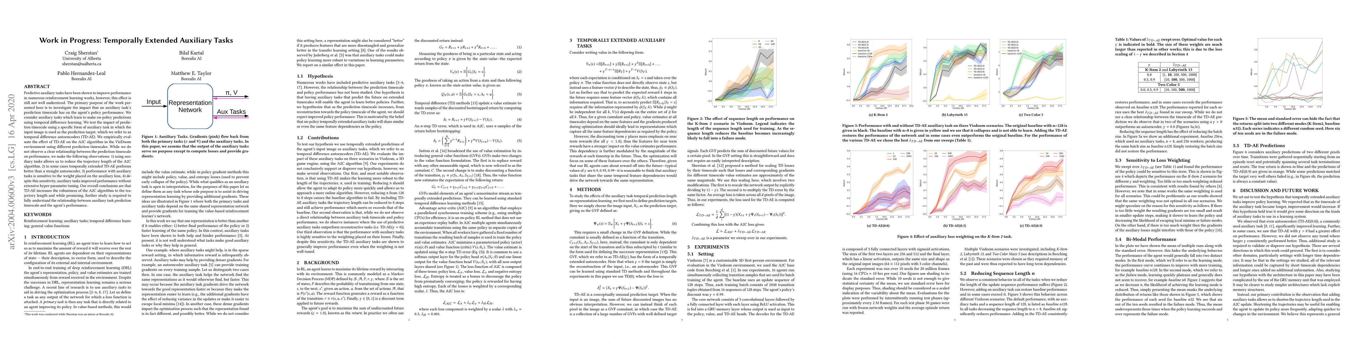 Predictive auxiliary tasks have been shown to improve performance in numerous reinforcement learning works, however, this effect is still not well understood. The primary purpose of the work presented here is to investigate the impact that an auxiliary task's prediction timescale has on the agent's policy performance. We consider auxiliary tasks which learn to make on-policy predictions using temporal difference learning. We test the impact of prediction timescale using a specific form of auxiliary task in which the input image is used as the prediction target, which we refer to as temporal difference autoencoders (TD-AE). We empirically evaluate the effect of TD-AE on the A2C algorithm in the VizDoom environment using different prediction timescales. While we do not observe a clear relationship between the prediction timescale on performance, we make the following observations: 1) using auxiliary tasks allows us to reduce the trajectory length of the A2C algorithm, 2) in some cases temporally extended TD-AE performs better than a straight autoencoder, 3) performance with auxiliary tasks is sensitive to the weight placed on the auxiliary loss, 4) despite this sensitivity, auxiliary tasks improved performance without extensive hyper-parameter tuning. Our overall conclusions are that TD-AE increases the robustness of the A2C algorithm to the trajectory length and while promising, further study is required to fully understand the relationship between auxiliary task prediction timescale and the agent's performance.