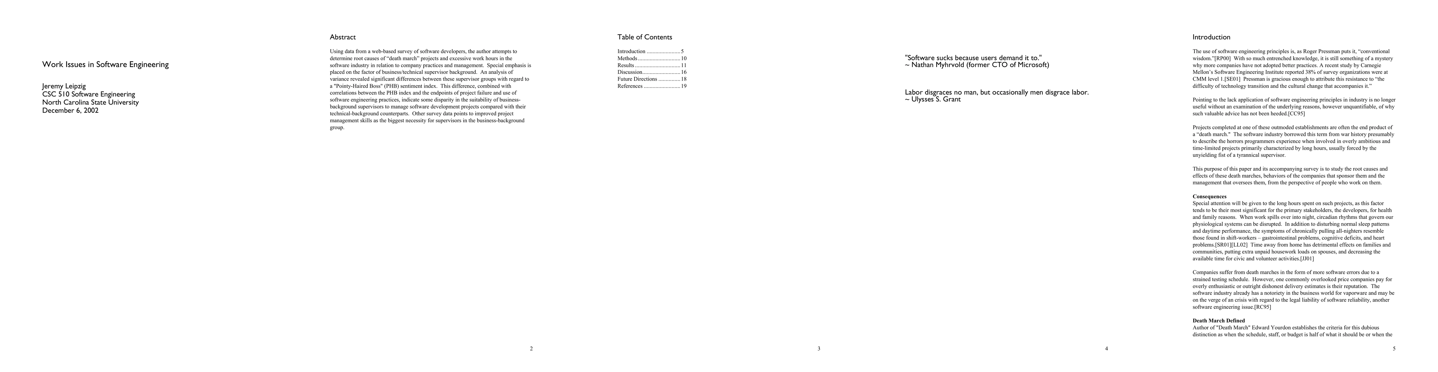 Using data from a web-based survey of software developers, the author attempts to determine root causes of "death march" projects and excessive work hours in the software industry in relation to company practices and management. Special emphasis is placed on the factor of business/technical supervisor background. An analysis of variance revealed significant differences between these supervisor groups with regard to a "Pointy-Haired Boss" (PHB) sentiment index. This difference, combined with correlations between the PHB index and the endpoints of project failure and use of software engineering practices, indicate some disparity in the suitability of businessbackground supervisors to manage software development projects compared with their technical-background counterparts. Other survey data points to improved project management skills as the biggest necessity for supervisors in the business-background group.