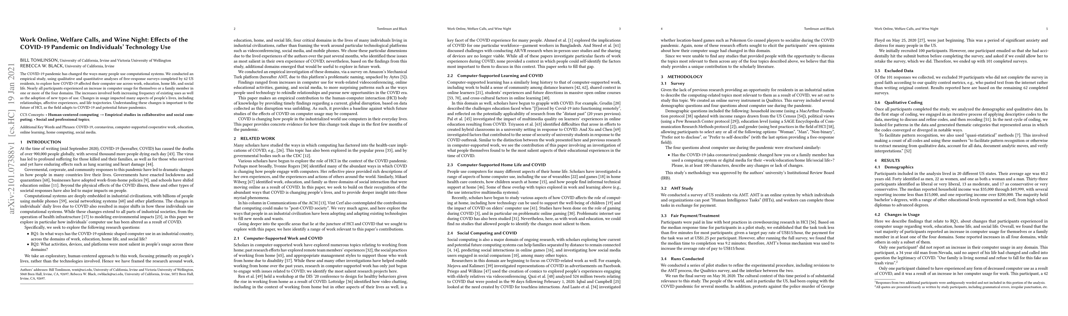 The COVID-19 pandemic has changed the ways many people use computational systems. We conducted an empirical study, using qualitative and quantitative analyses of free-response surveys completed by 62 US residents, to explore how COVID-19 affected their computer use across work, education, home life, and social life. Nearly all participants experienced an increase in computer usage for themselves or a family member in one or more of the four domains. The increases involved both increasing frequency of existing uses as well as the adoption of new types of use. Changes in usage impacted many aspects of people's lives, including relationships, affective experiences, and life trajectories. Understanding these changes is important to the future of HCI, as the field adapts to COVID-19 and potential future pandemics.