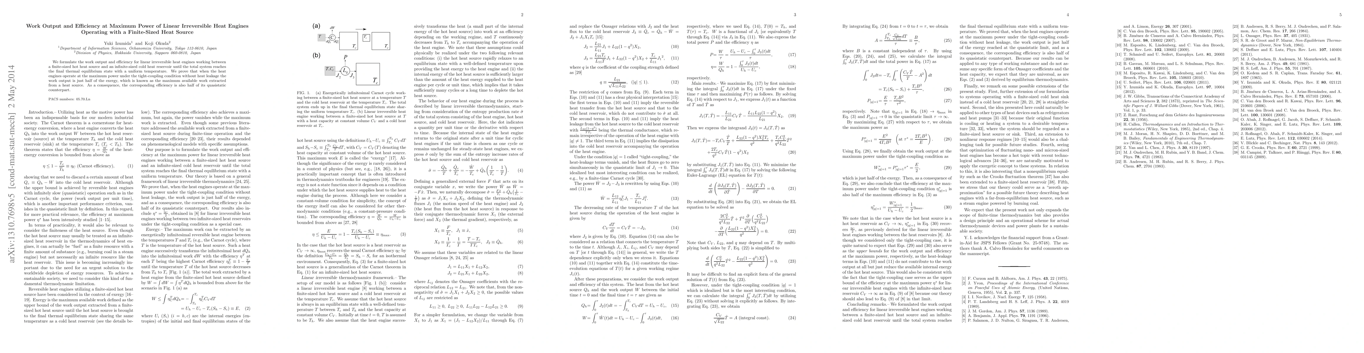 This paper investigates the work output and efficiency of linear irreversible heat engines operating between a finite-sized heat source and an infinite-sized cold reservoir, finding maximum power operation yields work output equal to half the exergy, resulting in efficiency that is half of the quasistatic counterpart.