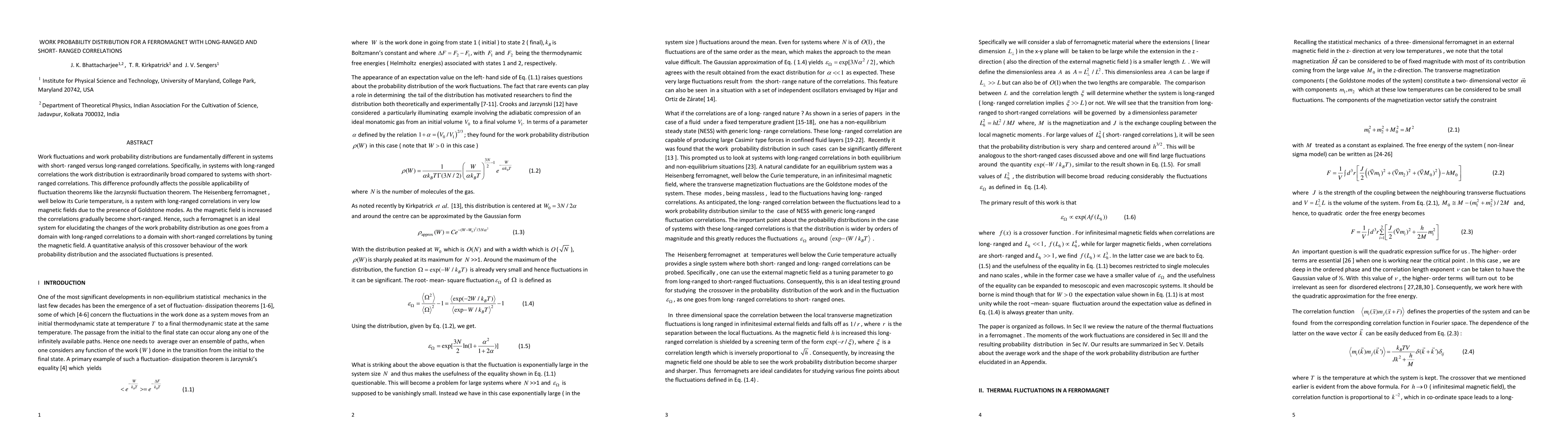 This research investigates how work probability distributions in a ferromagnet change from long-ranged to short-ranged correlations as magnetic fields are varied. The study highlights that long-ranged correlations lead to extraordinarily broad work distributions, impacting the applicability of fluctuation theorems like the Jarzynski theorem.