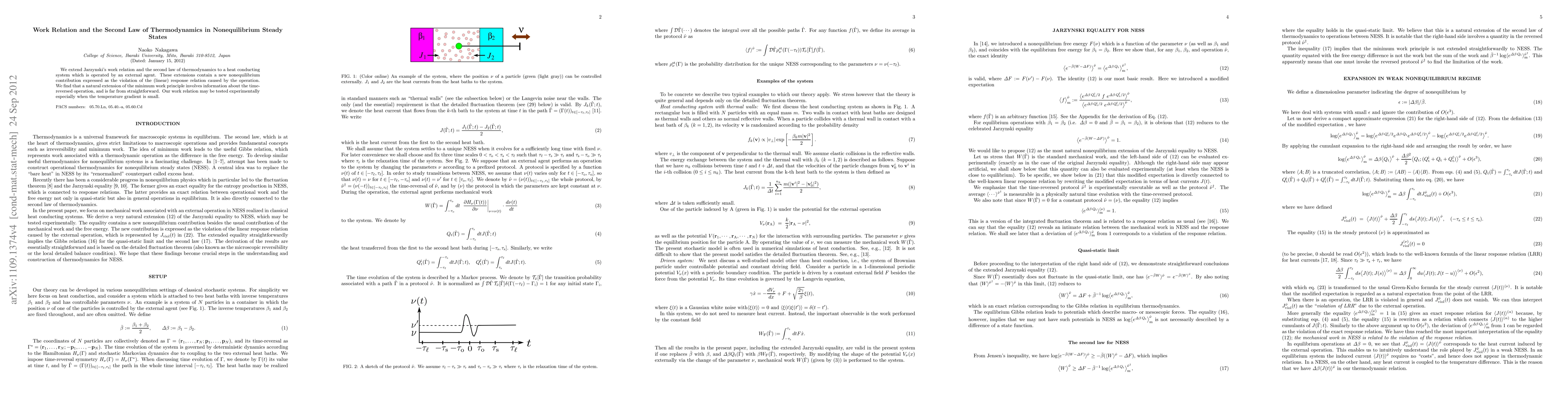 This paper extends Jarzynski's work relation and the second law of thermodynamics to nonequilibrium steady states in heat conducting systems, introducing a new nonequilibrium contribution. It finds that extending the minimum work principle requires information about the time-reversed operation, and suggests experimental testing when temperature gradients are small.