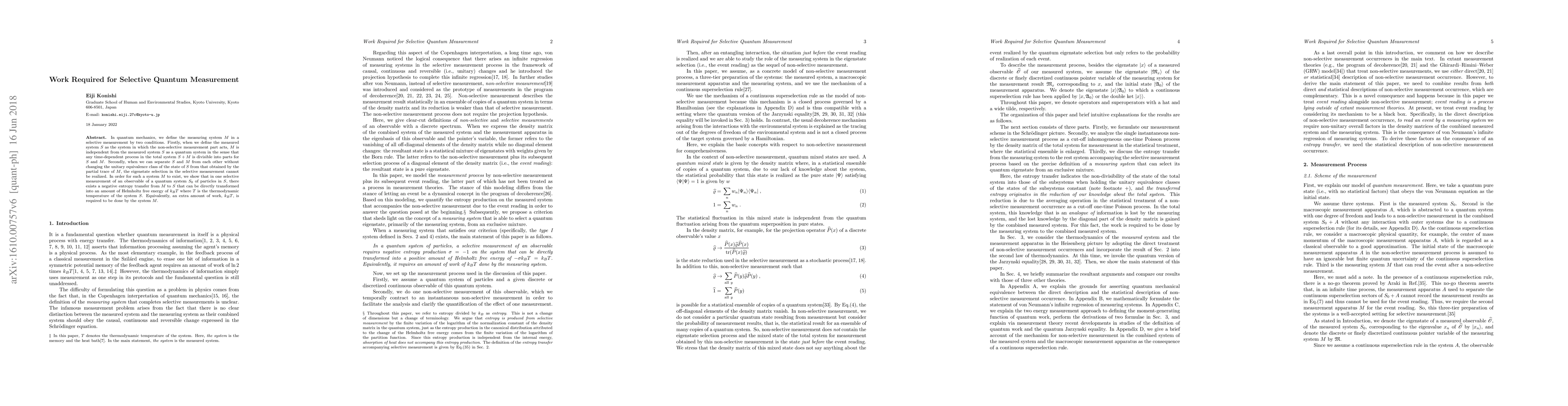 This paper explores the conditions for selective quantum measurement, demonstrating that a measuring system $M$ must perform an extra work of $k_BT$ to achieve selective measurement, corresponding to a negative entropy transfer from $M$ to the measured system $S$. This work is equivalent to the Helmholtz free energy at temperature $T$.