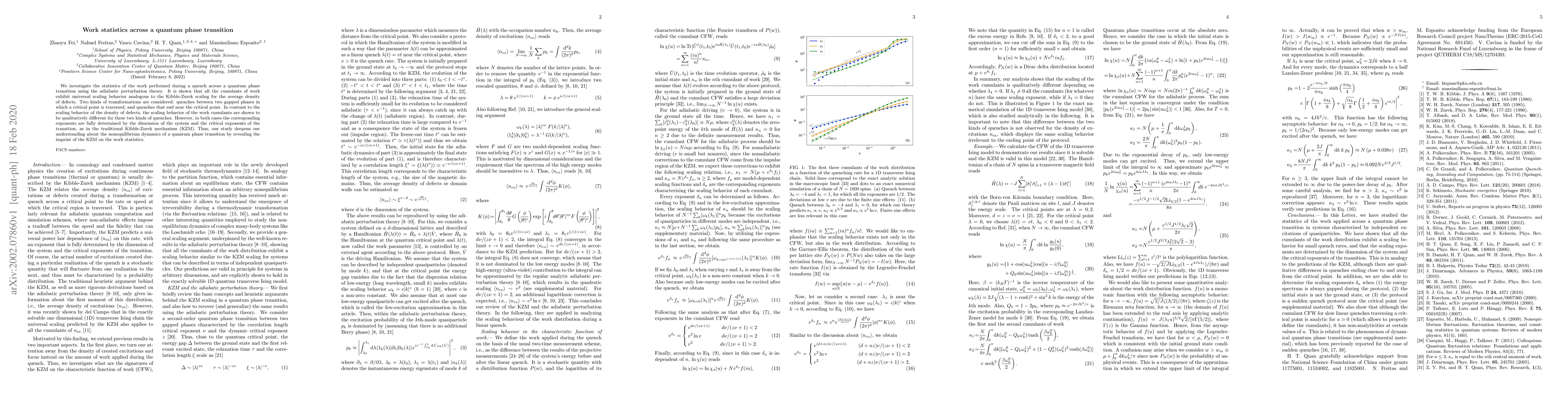 This paper explores the work statistics during quantum phase transitions via adiabatic perturbation theory, revealing universal scaling behaviors for work cumulants akin to Kibble-Zurek scaling. It distinguishes scaling behaviors for different types of quenches, yet finds that system dimension and critical exponents determine the scaling exponents, enhancing understanding of nonequilibrium dynamics in quantum phase transitions.