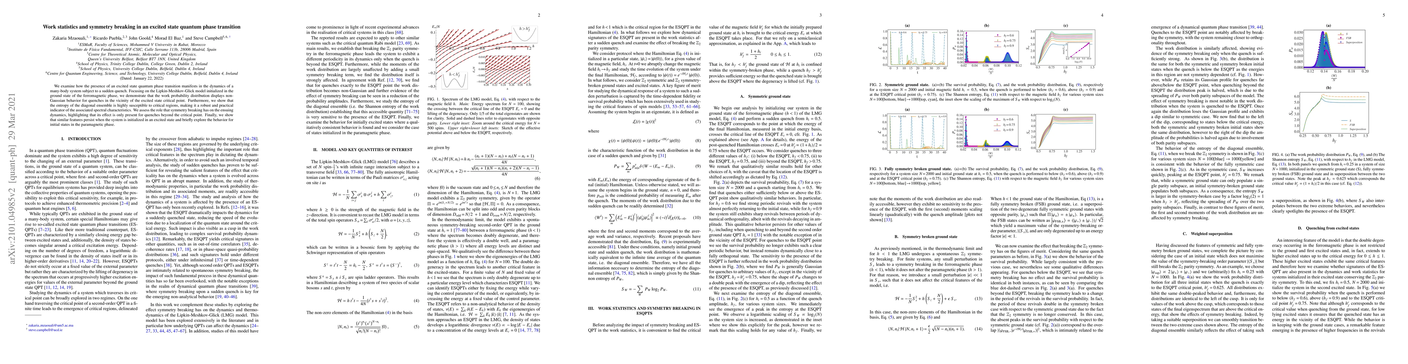 This paper investigates the dynamics of a many-body system undergoing a sudden quench near an excited state quantum phase transition, revealing non-Gaussian work probability distributions and a sensitive entropy of the diagonal ensemble near criticality. The study highlights that symmetry breaking influences the dynamics only beyond the critical point.