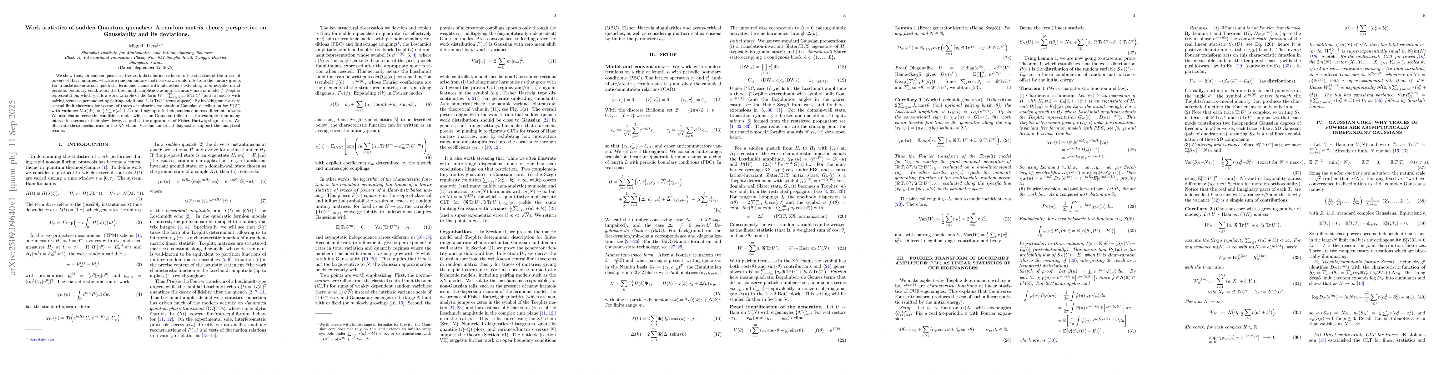 We show that, for sudden quenches, the work distribution reduces to the statistics of traces of powers of Haar unitaries, which are random unitary matrices drawn uniformly from the unitary group. For translation-invariant quadratic fermionic chains with interactions extending to $m$ neighbors and periodic boundary conditions, the Loschmidt amplitude admits a unitary matrix-model / Toeplitz representation, which yields a work variable of the form $W=\sum_{r\le m} a_r\,\mathrm{Re}\,\mathrm{Tr}\,U^r$ (and in models with pairing terms -- superconducting pairing -- additional $b_r\,\mathrm{Im}\,\mathrm{Tr}\,U^r$ terms appear). By invoking multivariate central limit theorems for vectors of traces of unitaries, we obtain a Gaussian distribution for $P(W)$ with variance $\mathrm{Var}(W)=\frac{1}{2}\sum_r r\,(a_r^2+b_r^2)$ and asymptotic independence across different powers. We also characterise the conditions under which non-Gaussian tails arise, for example from many interaction terms or their slow decay, as well as the appearance of Fisher--Hartwig singularities. We illustrate these mechanisms in the XY chain. Various numerical diagnostics support the analytical results.