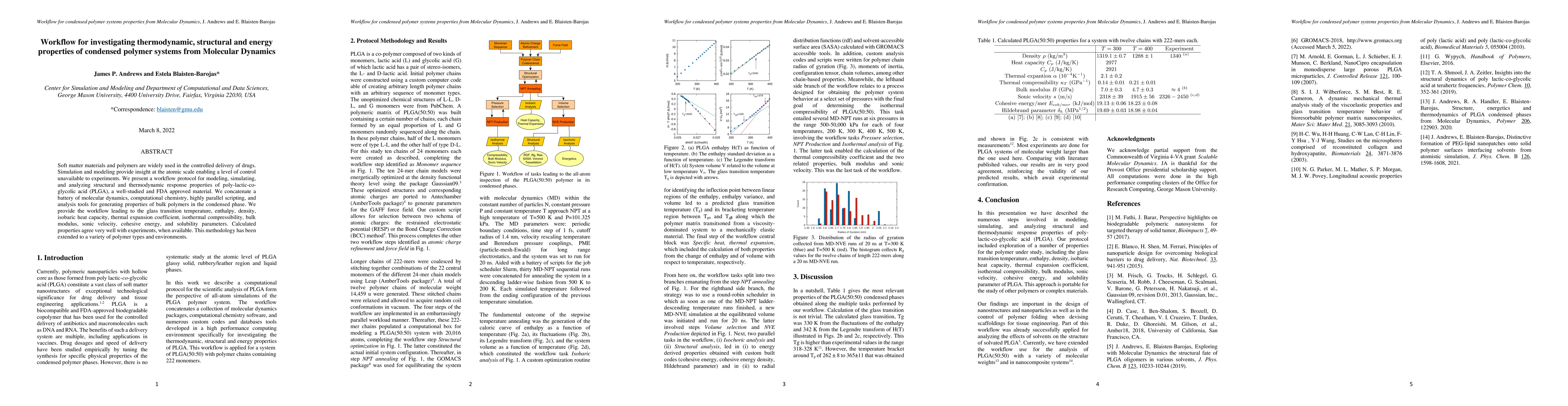 Soft matter materials and polymers are widely used in the controlled delivery of drugs. Simulation and modeling provide insight at the atomic scale enabling a level of control unavailable to experiments. We present a workflow protocol for modeling, simulating, and analyzing structural and thermodynamic response properties of poly-lactic-co-glycolic acid (PLGA), a well-studied and FDA approved material. We concatenate a battery of molecular dynamics, computational chemistry, highly parallel scripting, and analysis tools for generating properties of bulk polymers in the condensed phase. We provide the workflow leading to the glass transition temperature, enthalpy, density, isobaric heat capacity, thermal expansion coefficient, isothermal compressibility, bulk modulus, sonic velocity, cohesive energy, and solubility parameters. Calculated properties agree very well with experiments, when available. This methodology has been extended to a variety of polymer types and environments.