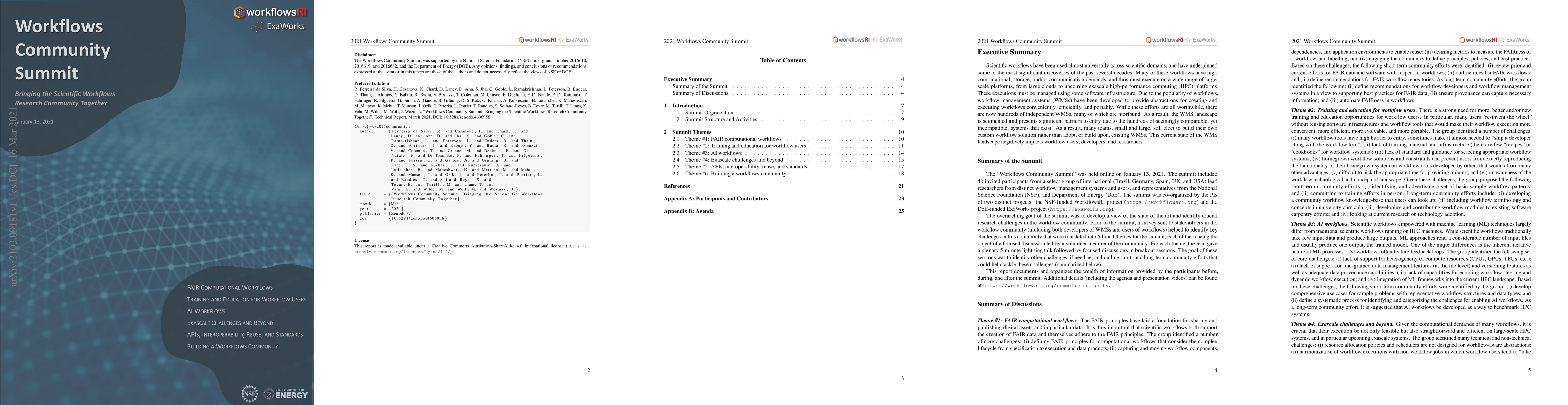 Scientific workflows have been used almost universally across scientific domains, and have underpinned some of the most significant discoveries of the past several decades. Many of these workflows have high computational, storage, and/or communication demands, and thus must execute on a wide range of large-scale platforms, from large clouds to upcoming exascale high-performance computing (HPC) platforms. These executions must be managed using some software infrastructure. Due to the popularity of workflows, workflow management systems (WMSs) have been developed to provide abstractions for creating and executing workflows conveniently, efficiently, and portably. While these efforts are all worthwhile, there are now hundreds of independent WMSs, many of which are moribund. As a result, the WMS landscape is segmented and presents significant barriers to entry due to the hundreds of seemingly comparable, yet incompatible, systems that exist. As a result, many teams, small and large, still elect to build their own custom workflow solution rather than adopt, or build upon, existing WMSs. This current state of the WMS landscape negatively impacts workflow users, developers, and researchers. The "Workflows Community Summit" was held online on January 13, 2021. The overarching goal of the summit was to develop a view of the state of the art and identify crucial research challenges in the workflow community. Prior to the summit, a survey sent to stakeholders in the workflow community (including both developers of WMSs and users of workflows) helped to identify key challenges in this community that were translated into 6 broad themes for the summit, each of them being the object of a focused discussion led by a volunteer member of the community. This report documents and organizes the wealth of information provided by the participants before, during, and after the summit.