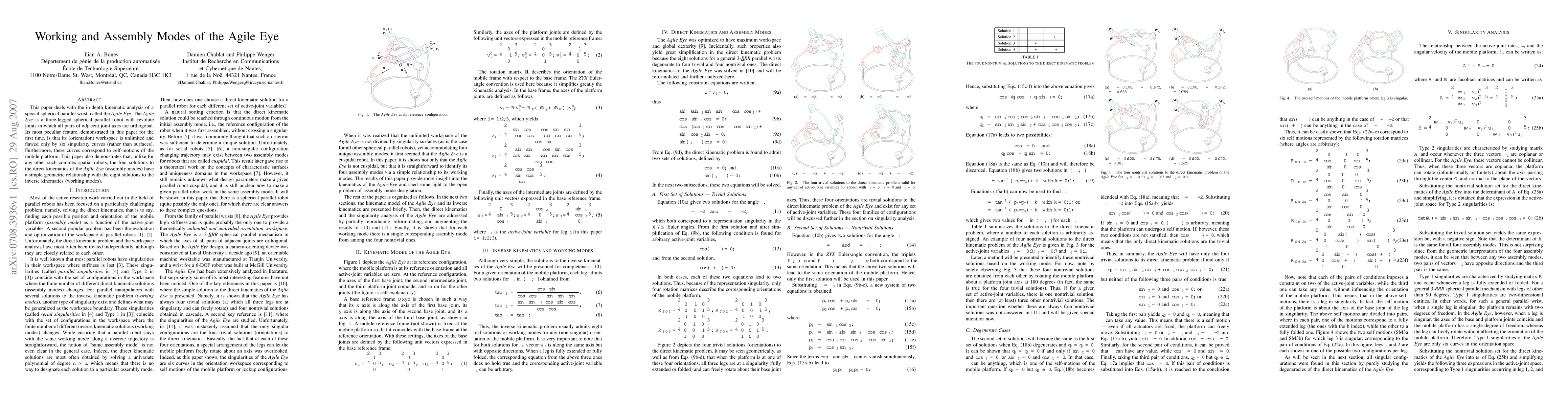 The Agile Eye, a 3D spherical parallel robot, has an unlimited workspace with only six singularities, and its kinematic analysis reveals simple geometric relationships between assembly modes and working modes.