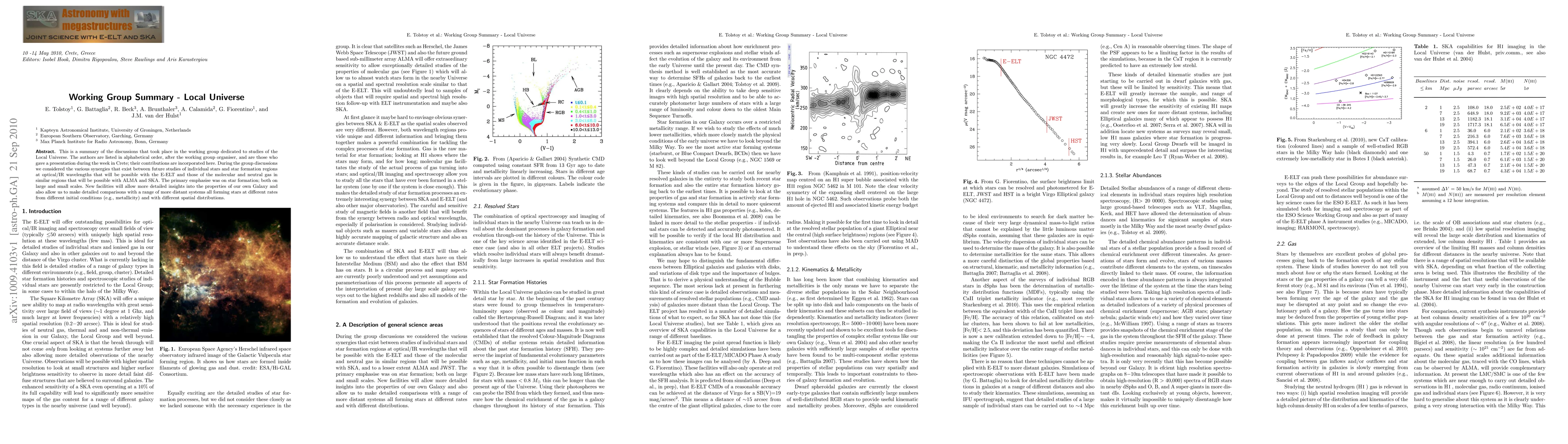 This is a summary of the discussions that took place in the working group dedicated to studies of the Local Universe. The authors are listed in alphabetical order, after the working group organiser, and are those who gave a presentation during the week in Crete; their contributions are incorporated here. During the group discussions we considered the various synergies that exist between future studies of individual stars and star formation regions at optical/IR wavelengths that will be possible with the E-ELT and those of the molecular and neutral gas in similar regions that will be possible with ALMA and SKA. The primary emphasise was on star formation; both on large and small scales. New facilities will allow more detailed insights into the properties of our own Galaxy and also allow us to make detailed comparisons with a range of more distant systems all forming stars at different rates from different initial conditions (e.g., metallicity) and with different spatial distributions.