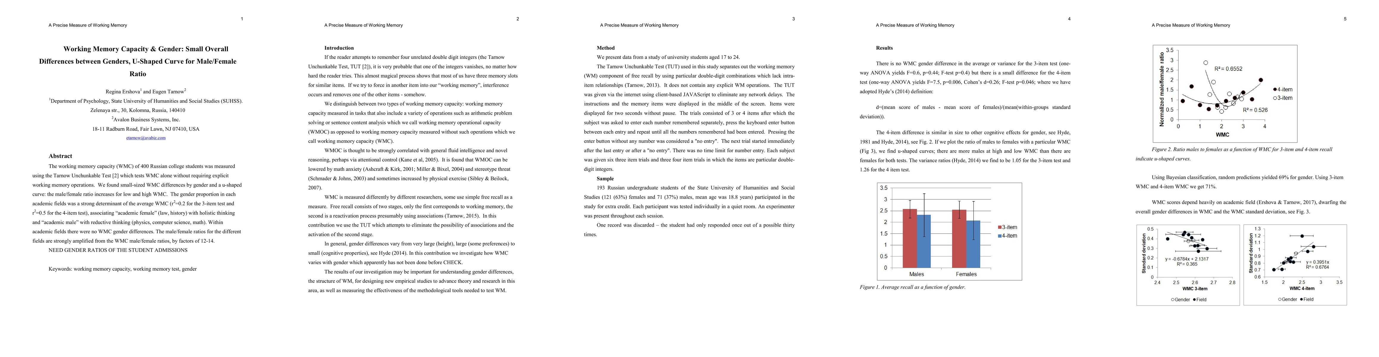The working memory capacity (WMC) of 400 Russian college students was measured using the Tarnow Unchunkable Test [2] which tests WMC alone without requiring explicit working memory operations. We found small-sized WMC differences by gender and the possibility that the male/female ratio increases for low and high WMC creating a u-shaped curve. The gender proportion in each academic fields was a strong determinant of the average WMC (r2=0.2 for the 3-item test and r2=0.5 for the 4-item test), associating "academic female" (law, history) with holistic thinking and "academic male" with reductive thinking (physics, computer science, math). Within academic fields there were no WMC gender differences. The male/female ratios for the different fields are strongly amplified from the WMC male/female ratios, by factors of 12-14.