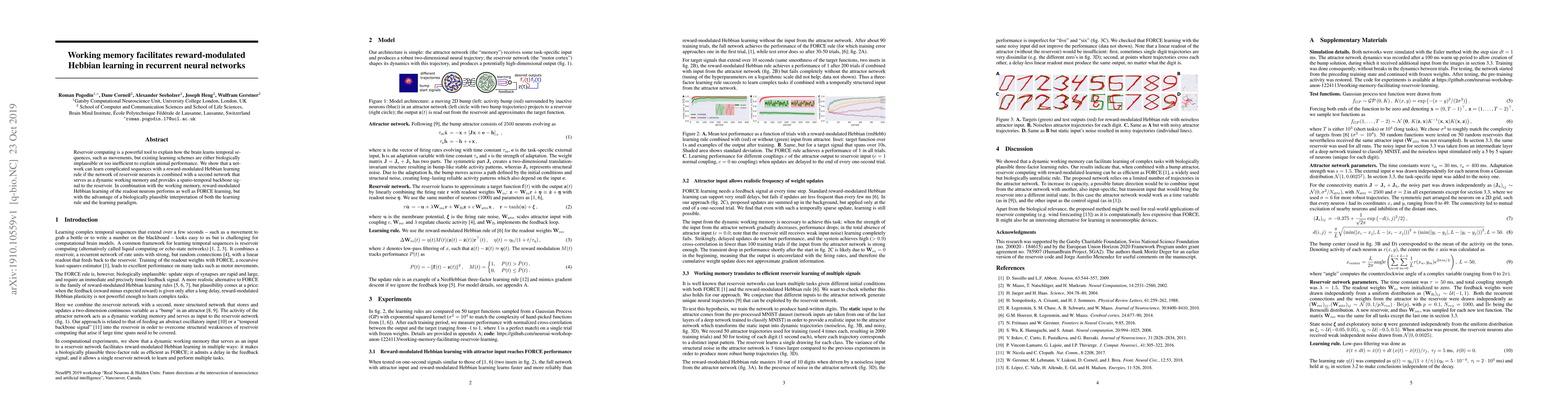 Reservoir computing is a powerful tool to explain how the brain learns temporal sequences, such as movements, but existing learning schemes are either biologically implausible or too inefficient to explain animal performance. We show that a network can learn complicated sequences with a reward-modulated Hebbian learning rule if the network of reservoir neurons is combined with a second network that serves as a dynamic working memory and provides a spatio-temporal backbone signal to the reservoir. In combination with the working memory, reward-modulated Hebbian learning of the readout neurons performs as well as FORCE learning, but with the advantage of a biologically plausible interpretation of both the learning rule and the learning paradigm.